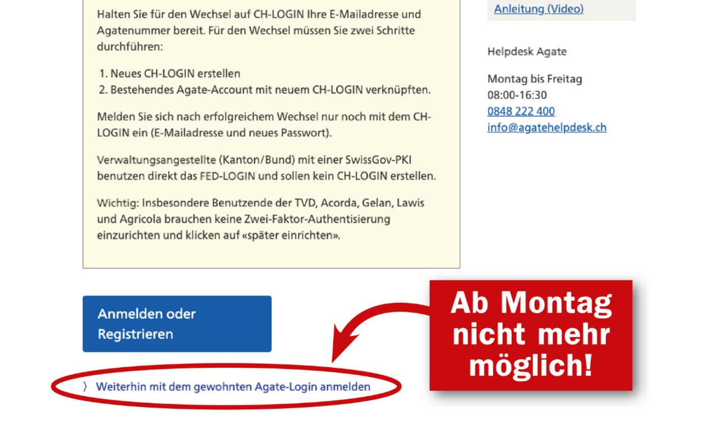 Seit Ende April können die Agate-Benutzenden die Umstellung des Logins durchführen. «Wir haben auf verschiedenen Kanälen informiert und die Agate-Benutzenden auch direkt per E-Mail angeschrieben», schreibt das BLW auf Anfrage. Doch die Umstellung ist trotz intensiver Informationskampagne noch lange nicht überall vollzogen.