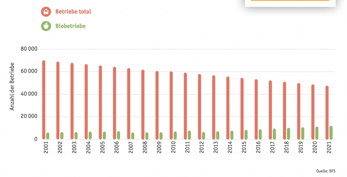 Die Zahl der Landwirtschaftsbetriebe sank 2021 im Vergleich zum Vorjahr um 1,0% auf 48'864. Der Rückgang lag damit unter dem Mittelwert der letzten fünf Jahre (-1,5 %). Die Zahl der Betriebe mit einer Fläche von 5 bis 20 Hektaren nahm um 2,8 % ab, jene mit einer Fläche von über 30 Hektaren hingegen um 1,3 % zu. Im Durchschnitt umfassten die Betriebe 21,3 Hektaren. 2021 gab es 7670 Bio-Betriebe, ein Plus von 1,4 % gegenüber dem Vorjahr.