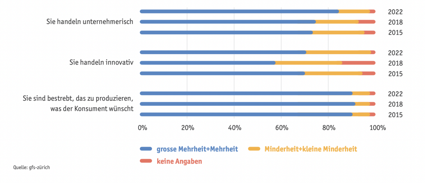 - So sind neun von zehn Personen der Meinung, die Bäuerinnen und Bauern seien bestrebt zu produzieren, was die Konsumentinnen und Konsumenten wünschen.