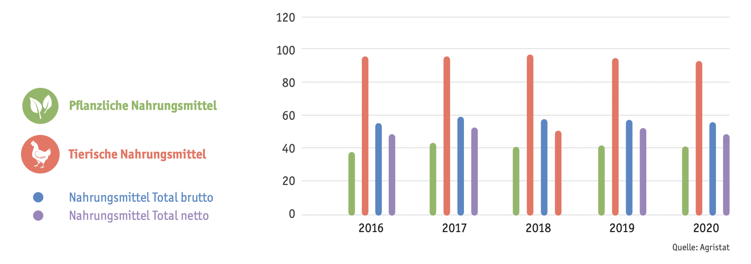 Den höchsten Selbstversorgungsgrad (SVG) weist die Schweiz bei Milch und Milchprodukten auf, bei denen regelmässig mehr als 100 Prozent des inländischen Bedarfs produziert werden. Hingegen liegt er bei pflanzlichen Ölen und Fetten bei nur 24 Prozent. Bei allen Nahrungsmitteln ist der SVG leicht rückläufig.
