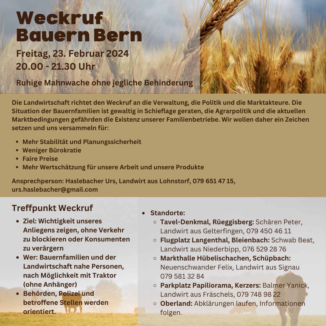 Die Bauernfamilien, die hinter dem «Weckruf Bauern Bern» stehen, treffen sich (auch mit landwirtschaftlichen Fahrzeugen) am 23. Februar 2024, 20.00 - 21.30 Uhr an verschiedenen Standorten auf organisierten Plätzen. Die Behörden, Polizei und betroffene Stellen werden orientiert.