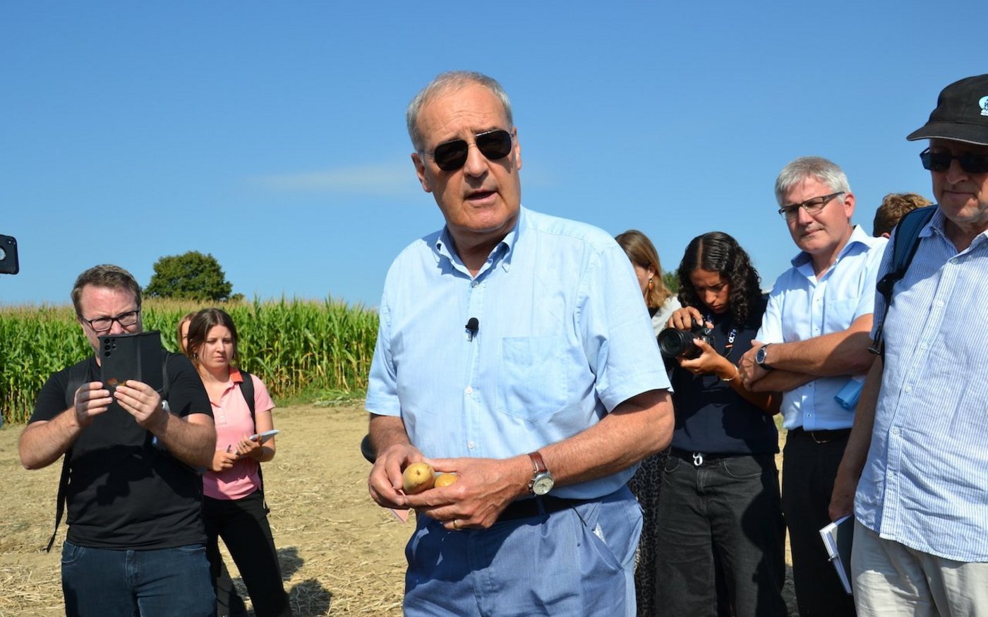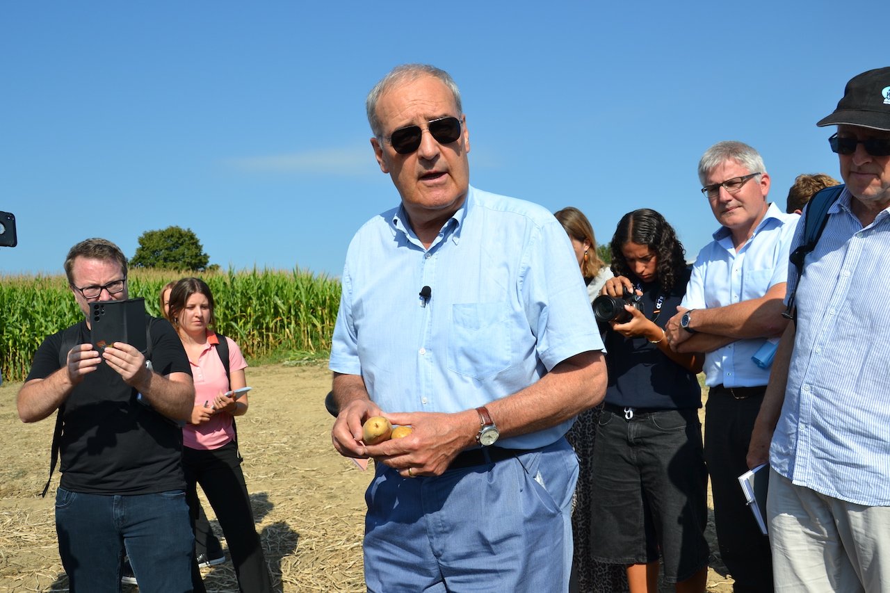 Eine halbstündige Autofahrt von Bundesbern entfernt steht Bundesrat Guy Parmelin schwitzend im Kartoffelfeld von Christoph Herren. Der Landwirt erzählte den versammelten Pressevertretern vom schwierigen Kampf gegen die Krautfäule im nassen Frühling. «Ich habe sehr viel in den Schutz der Kultur investiert», betont er. Bei ihm seien Qualität und Menge zufriedenstellend – im Gegensatz zu einigen Berufskollegen. «Aber ein Jahr wie dieses hätte vor 100 Jahren eine Hungersnot gegeben», bemerkte Herren. Die Produzentenpreise müssten steigen, um die teureren Produktionsmittel und häufigeren Wetterextreme bewältigen zu können. «Ich muss ein schlechtes Jahr mit einem überdurchschnittlich guten kompensieren können», gab Herren zu bedenken.