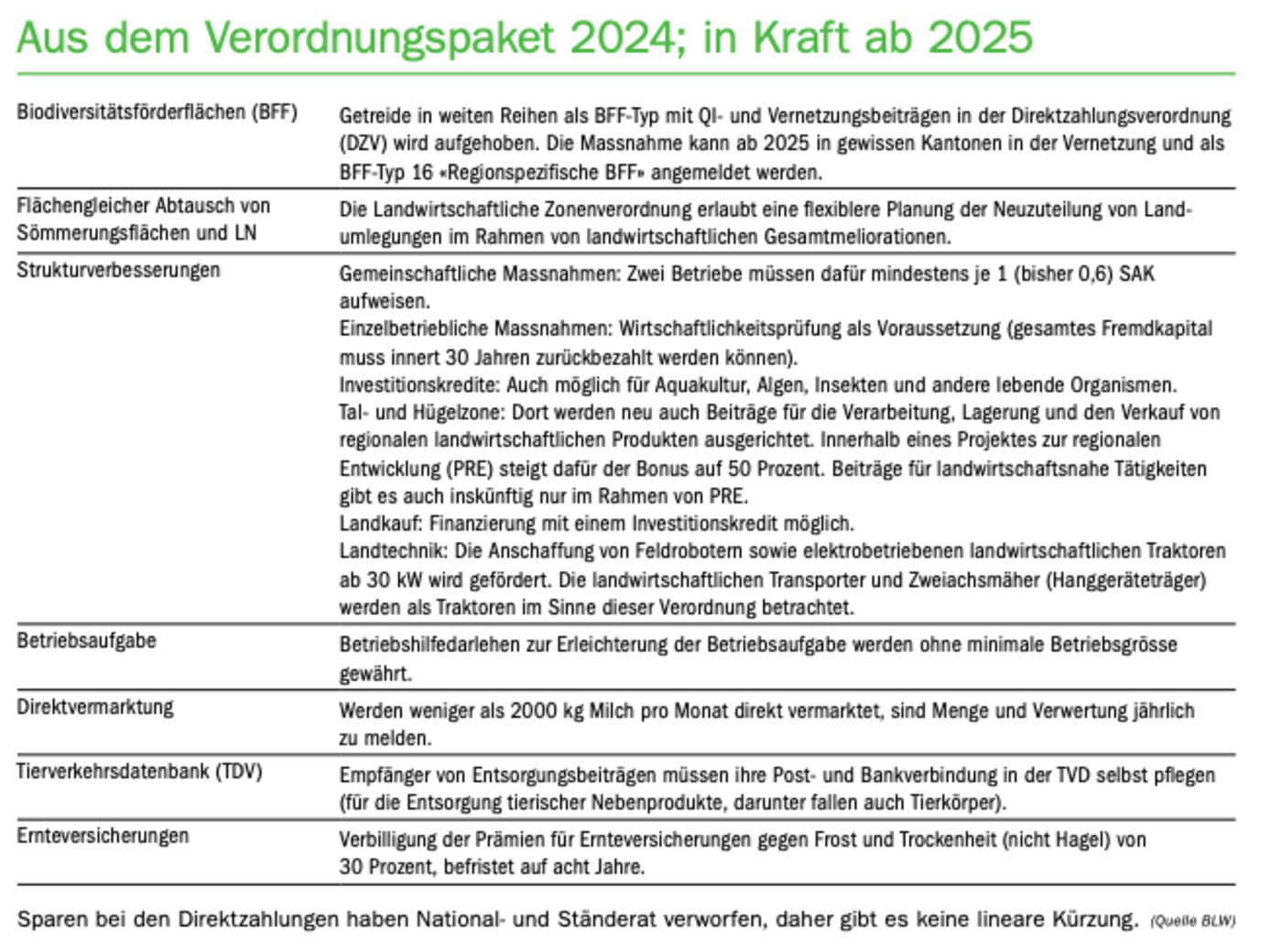 Das umfangreiche Verordnungspaket 2024 enthält vieles, das noch nicht nächstes Jahr in Kraft tritt. Per 2025 wird aber die Strukturverbesserungs-Verordnung umfassend revidiert (siehe unten). Es handelt sich dabei um Beschlüsse, die das Parlament im Rahmen des AP-22+-Mini-Pakets gefällt hat, ebenso wie z. B. die neue Prämienverbilligung für Ernteversicherungen. Für den Markt Neben Politik und Verwaltung waren auch…