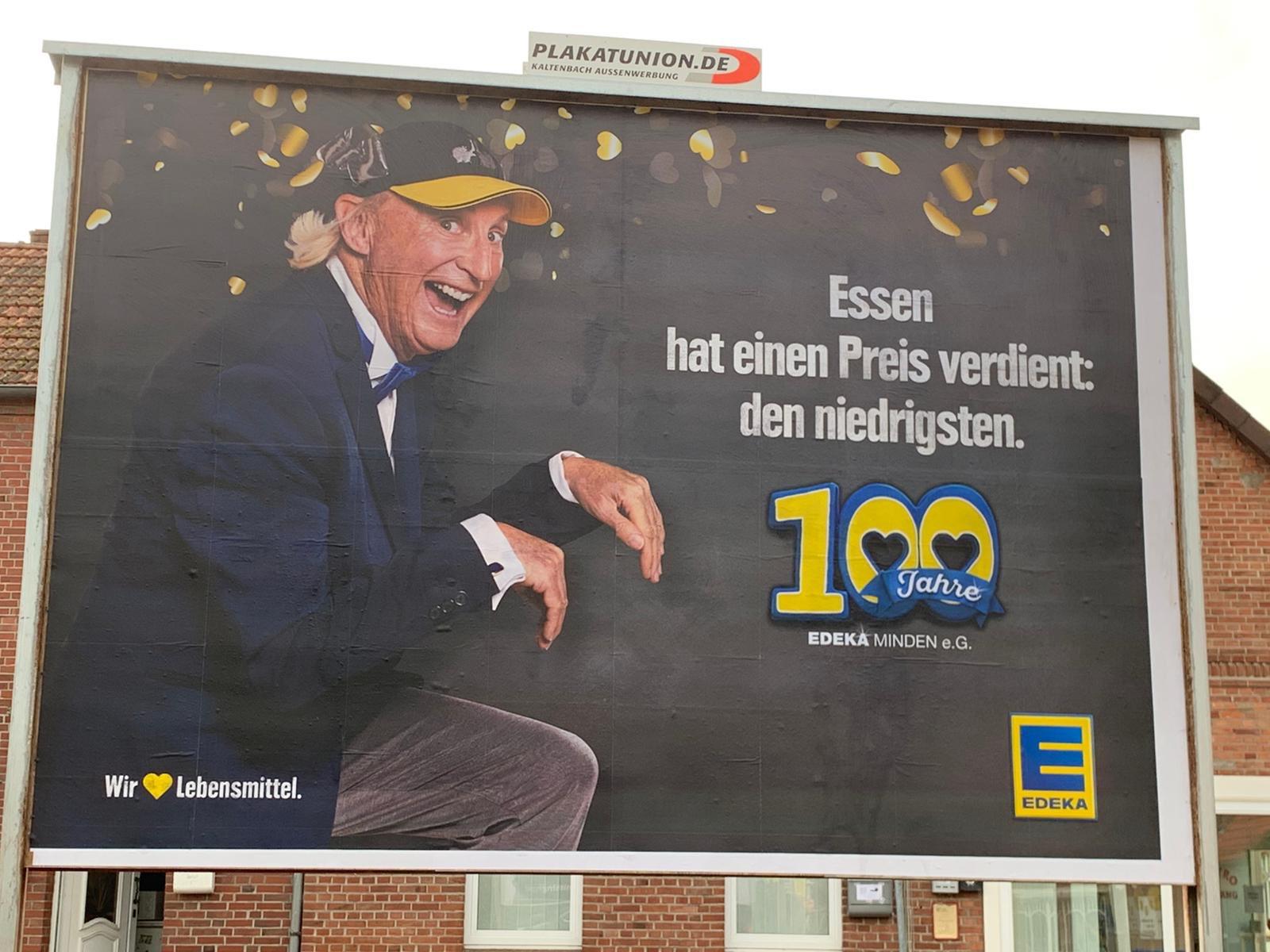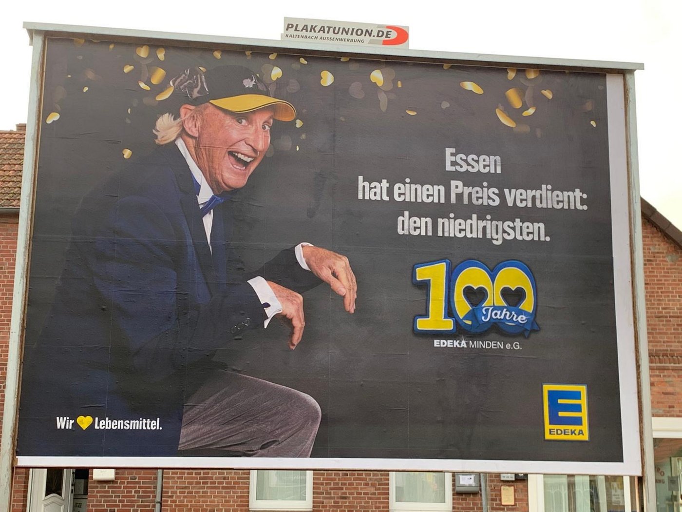 Der Protest der Landwirte richtete sich gegen den Edeka-Verbund, einen der führenden Lebensmittelhändler in Deutschland. Edeka wirbt mit dem Slogan "Wir lieben Lebensmittel". Zum 100-jährigen Jubiläum in der Stadt Minden lancierte der Verbund eine neue Werbung mit dem Komiker Otto Waalkes. Der Spruch dazu kam bei den Landwirtinnen und Landwirten aber gar nicht gut an: "Essen hat einen Preis verdient: den niedrigsten".