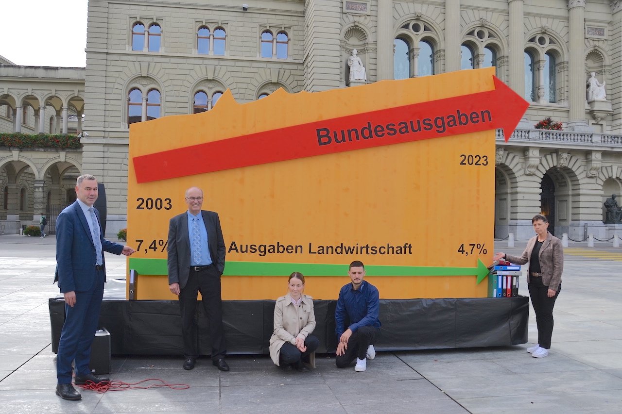 «Wenn alle Ausgabenbereiche so sorgsam mit ihren Mitteln umgegangen wären wie die Landwirtschaft, dann hätten wir auf Bundesebene einen riesigen Überschuss von 40 Milliarden Franken», stellte Martin Rufer klar. Der Direktor des Schweizer Bauernverbandes (SBV) erläuterte auf dem Bundesplatz, wie die Landwirtschaft dreifach von den Sparplänen zur Behebung des Bundes-Finanzlochs betroffen ist: