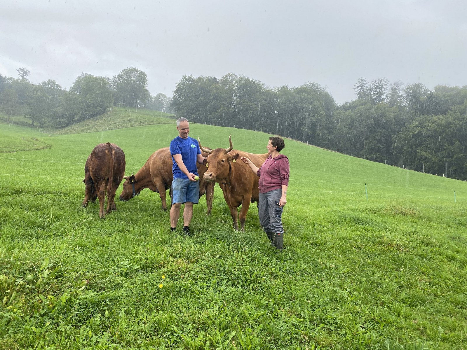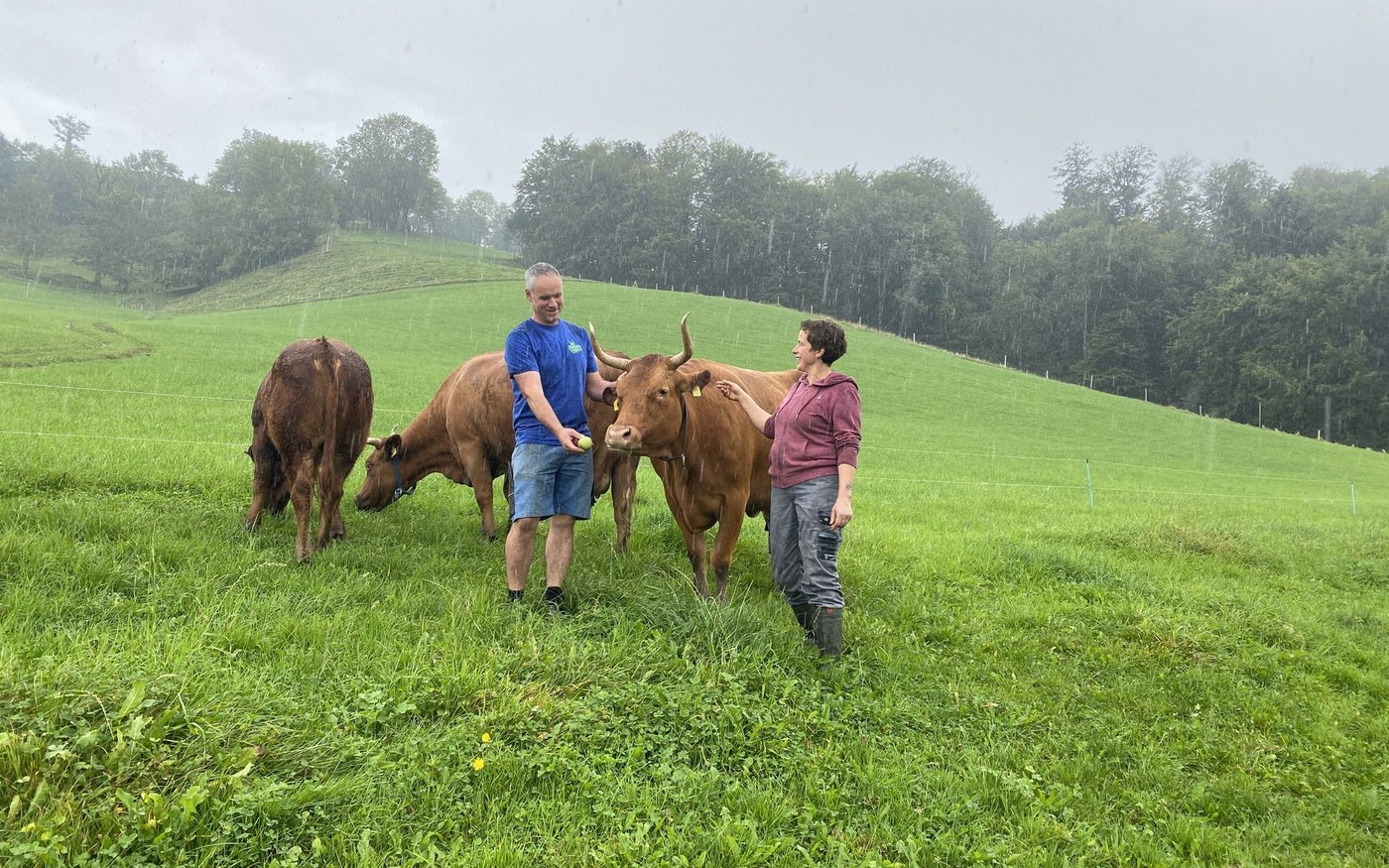 Bänz Stalder ist auf der Pfandersmatt mit Hornkühen aufgewachsen. «Früher war das einfach normal», erinnert er sich. Als Mirjam Walde zur Patchwork-Familie dazu stiess, habe man die Hörner diskutiert und gemeinsam entschieden: «Wir haben Hörner», wie es die Bäuerin formuliert.