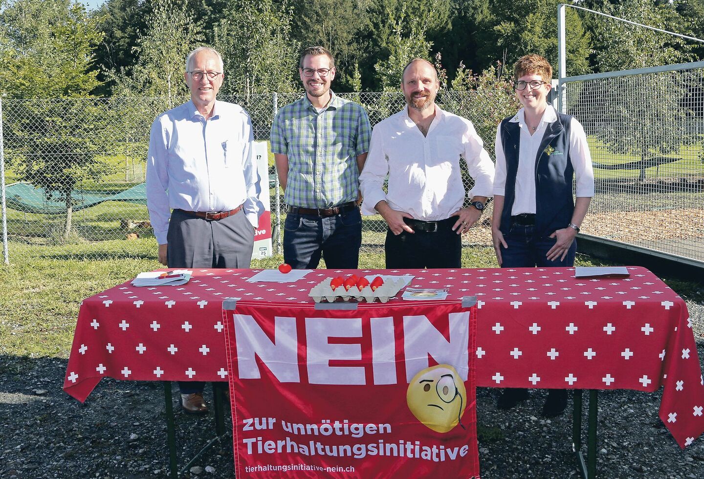 Die Argumente gegen die Massentierhaltungs-Initiative (MTI) präsentierte das Zuger Komitee bewusst auf einem Pouletmastbetrieb. Daniel Sidler leitet den Waldhaus-Hof in Hünenberg seit 2019. Die beiden geschlechtergemischten Gruppen umfassen 4100 und 4500 Hühner. Produziert wird für das Label Coop-Naturafarm. Er schilderte die Auswirkungen der MTI für ihn: «Diese Haltungsform wäre nicht mehr möglich. Wir müssten die Herden in den Ställen bis zum 21. Tag auf 2000 senken und anschliessend in 500er-Einheiten auf der Weide ausmästen. Für so viele Hütten würden die notwendigen Flächen fehlen.»