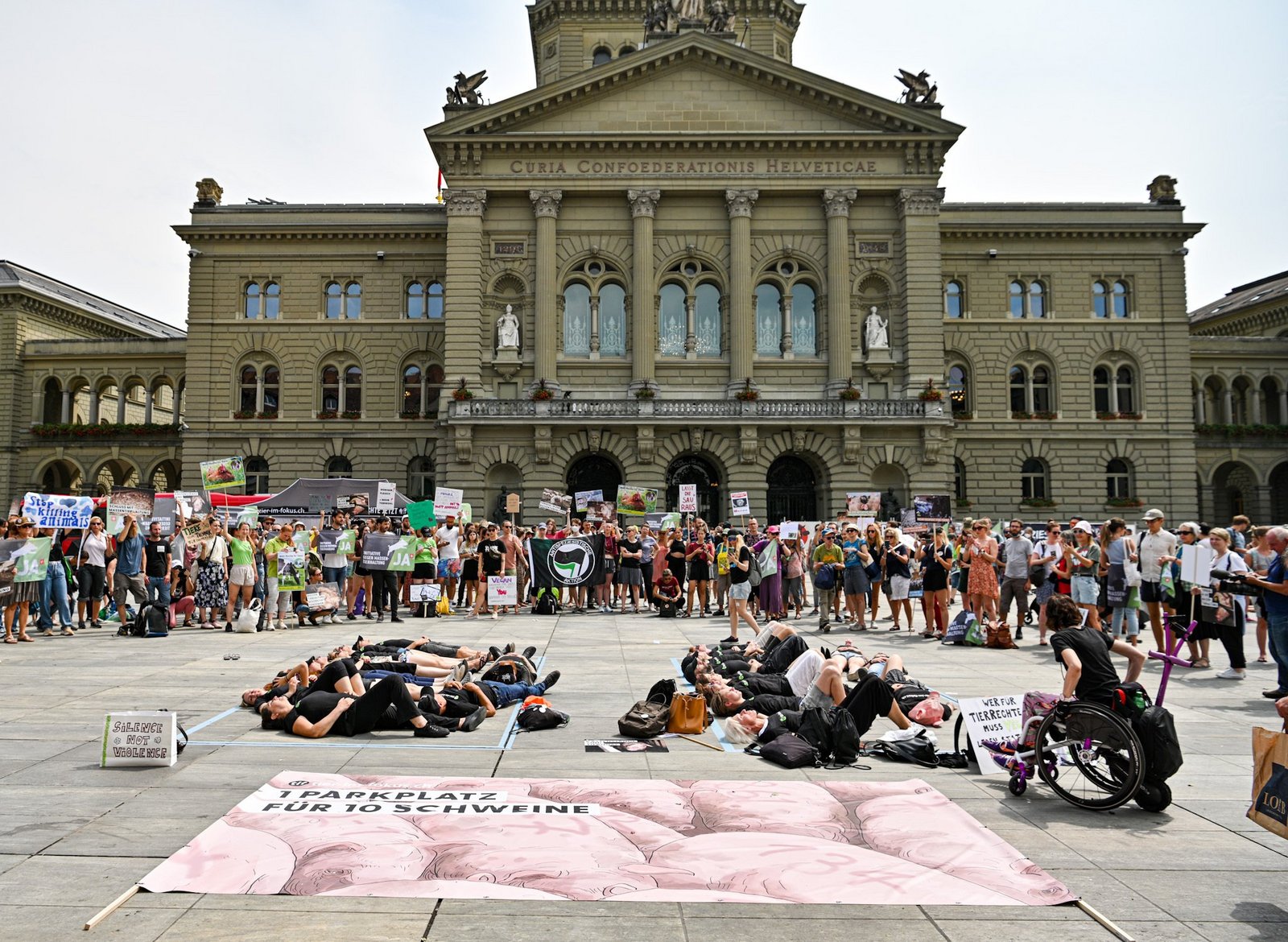 Mit der Demonstration wollte die Organisation "Tier im Fokus" die Abstimmungskampf gegen die Massentierhaltung unterstützen. Die Teilnehmer skandierten Slogans zu Trommelklängen und hielten Transparente hoch, wie eine Korrespondentin der Nachrichtenagentur Keystone-SDA meldete.