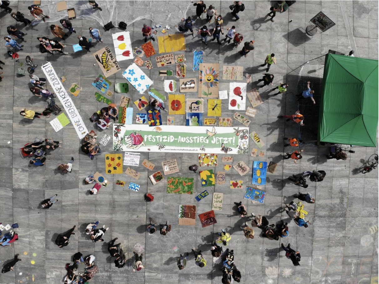 Unter dem Slogan «Zeit für einen Aufbruch» hatten die Organisatorinnen und Organisatoren dazu aufgerufen, ein buntes Zeichen auf dem Bundesplatz zu setzen. Mit einem Riesenbild verliehen sie ihrer Forderung nach einem sofortigen «Pestizid-Ausstieg» eine optische Gestalt, während eine Live-Band musikalisch für Stimmung sorgte. «Landwirtschaft mit Zukunft» versteht sich sowohl als Organisation als auch als Bewegung. Ins Leben gerufen wurde die Gruppierung vor allem durch junge Aktivistinnen und Aktivisten aus dem Umfeld der Klima-Bewegung. Wie die Organisation auf ihrer Website schreibt, vereint sie Menschen mit unterschiedlichsten Hintergründen, deren gemeinsames Ziel eine «soziale, bäuerliche und agrarökologische Landwirtschaft» ist.