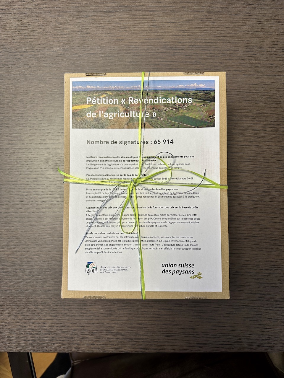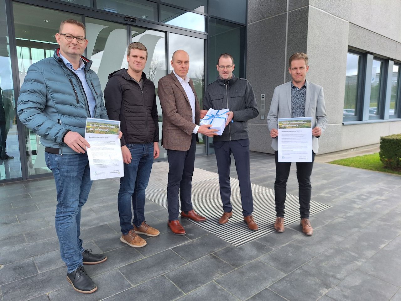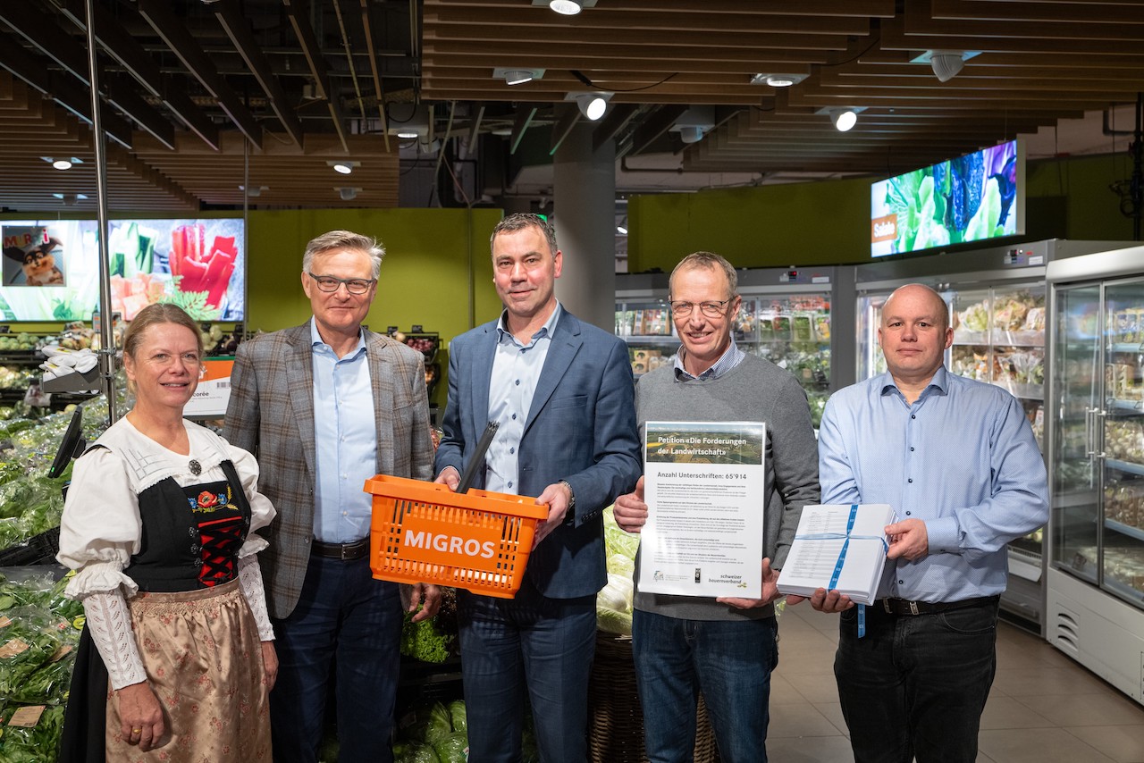 «Höre die Hilfeschreie vom Land und unterstütze unsere Landwirtschaft in ihren Forderungen nach besseren Bedingungen für die Bauernfamilien» hiess es in der Petition des Schweizer Bauernverbands (SBVs), der Westschweizer Bauernvereinigung Agora und der Junglandwirte. Innert weniger Tage haben über 65'000 Menschen online für eine rentable Landwirtschaft unterschrieben, freut sich der SBV in einer Mitteilung. Heute fand die Übergabe der Petition statt – und zwar in fünffacher Ausführung.