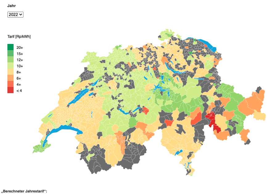 Der Vese hat eine interaktive Karte erstellt, auf der die Tarife der Elektrizitätswerke in der ganzen Schweiz sichtbar sind: https://www.vese.ch/pvtarif/