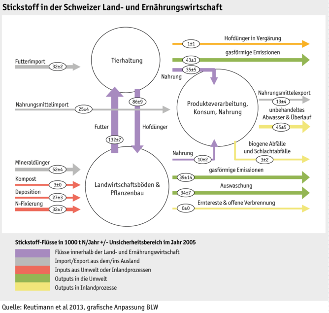 Gemäss Agrarbericht 2016 des Bundesamtes für Landwirtschaft sind vor allem importierte Mineraldünger und Futtermittel – indirekt in der Gülle – Schuld an der Überlastung des Systems. Schon seit Jahren verlangt die Politik von der Landwirtschaft, dass sie ihre Stickstoffeffizienz verbessert. Obwohl die Landwirtschaft in den letzten Jahren einiges dafür getan hat, wurden in den letzten Jahren unter dem Strich kaum Verbesserungen erzielt. Der Druck auf die Landwirtschaft wächst deshalb. Vor allem die Trinkwasserinitiative, welche den Import von Futtermitteln reduzieren will, hat viel Dynamik in die politischen Diskussionen hereingebracht.