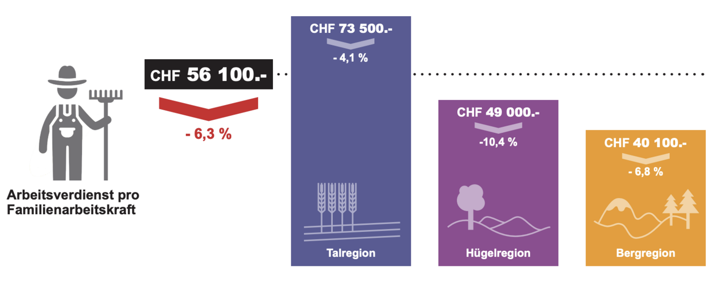 Gesunken sei 2022 der landwirtschaftliche Arbeitsverdienst pro Familienarbeitskraft (Vollzeit-Äquivalent) gegenüber dem Vorjahr im Durchschnitt aller Betriebe um 6,3 Prozent auf 56'100 Franken. In der Talregion sank der Arbeitsverdienst pro Familienarbeitskraft auf 73'500 Franken (4,1 %), in der Hügelregion auf 49'000 Franken (10,4 %) und in der Bergregion auf 40'1000 Franken (6,8 %).