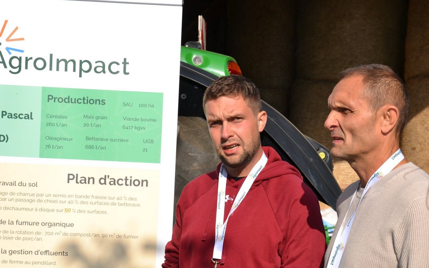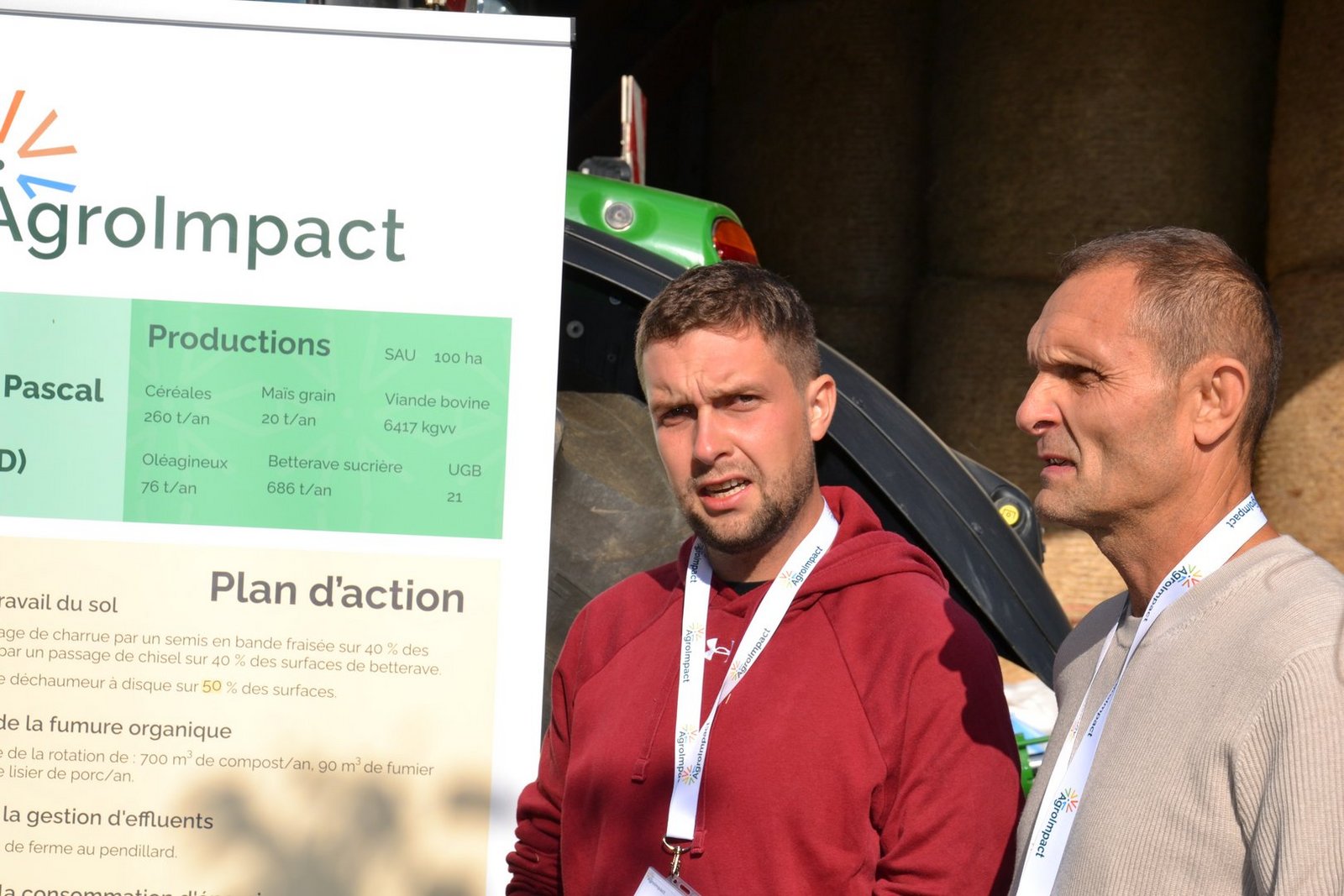 Pascal von Bergen und Jean-Paul Houmard aus Champoz BE bearbeiten ihre Böden nur noch maximal 7 cm tief mit einer Scheibenegge und säen die Hälfte ihres Getreides direkt. Insgesamt bewirtschaften sie 58 ha im Berner Jura, der Schwerpunkt liegt auf der Produktion von Käsereimilch. Die Fütterung ihres Milchviehs (86 GVE) wurde durch die Installation einer Heubeulüftung und einem höheren Anteil Leguminosen (30–40 %) in den Kunstwiesen verbessert und die Kraftfuttermenge verringert. Zusammen mit der Reduktion des Erstkalbealters von 29,8 auf 27 Monate resultiert so nach Berechnungen von Climacert eine Verkleinerung des betrieblichen Klimafussabdrucks um 12 Prozent.