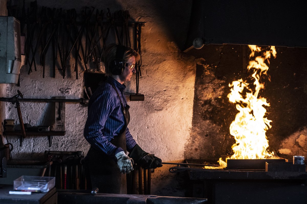 Zum Reden hat sie jetzt keine Zeit. Konzentriert schlägt Maja Zbinden gleichmässig mit dem Schmiedehammer auf das glühend heisse Metall. Funken stieben, grellharte Schlaggeräusche hallen durch den Raum. Dann bearbeitet sie das Metallstück mit einer groben Bürste, streut ein Pulver darüber und schiebt es zurück ins Feuer. In der Pulverdose sei Borax, ein Schmelzpulver, wird die Schmiedin später erklären. Doch jetzt…