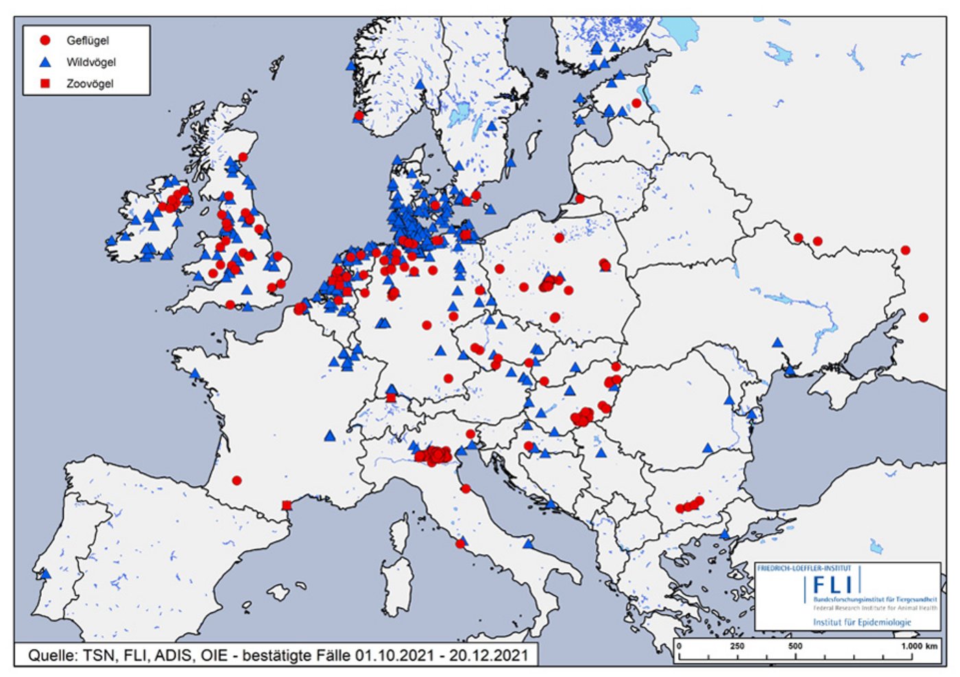 Allein in Deutschland wurden seit Anfang Oktober 394 Infektionen bei Wildvögeln wie Wildenten, Wildgänsen, Schwänen und Möwen erfasst, hauptsächlich entlang der Küste und insbesondere in Schleswig-Holstein. Zudem wurden vom FLI 46 Ausbrüche in Geflügelhaltungen registriert, allein 18 davon in Niedersachsen.