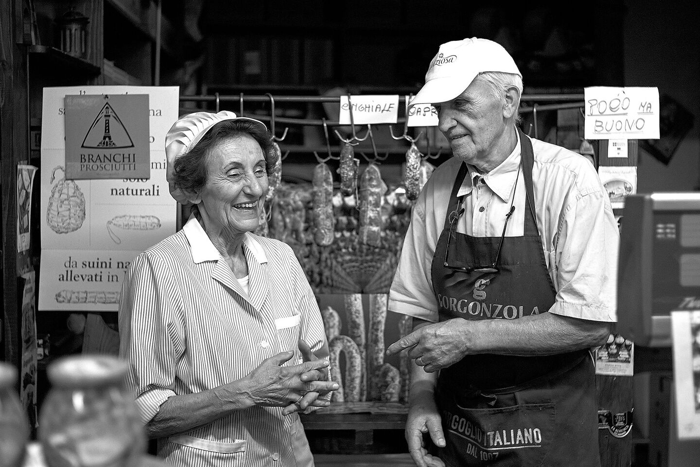 Lucianos Grossvater begann im Jahr 1900. Damals war er nur ein Schweinemetzger, den jede Familie hatte. Nachdem er das Fleisch zubereitet hatte, kamen alle zusammen und feierten mit Essen. Lucianos Vater starb, als er noch klein war, und seine Mutter öffnete den Laden jeden Tag, auch sonntags, um 6 Uhr morgens. Luciano fing an, als er erst 12 war. Die Familie ass dort zu Mittag und unterbrach ihre Mahlzeit jedes Mal, wenn die Glocke läutete und ein Kunde kam. Jeder Kunde hatte ein blaues Buch in den alten Regalen, in dem sich sein Guthaben mit jeder Flocke gereiften Parmesans, jedem Tropfen kaltgepressten Öls ansammelte. Sie warteten darauf, dass ihr Gehalt bezahlt wurde. «Sonst hätten sie nicht essen können!»