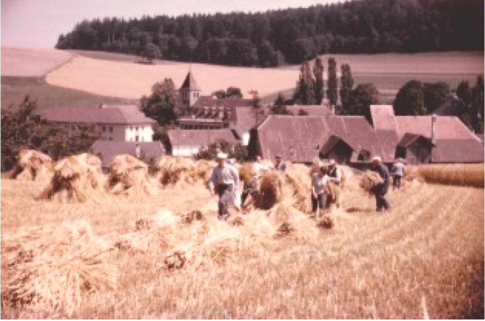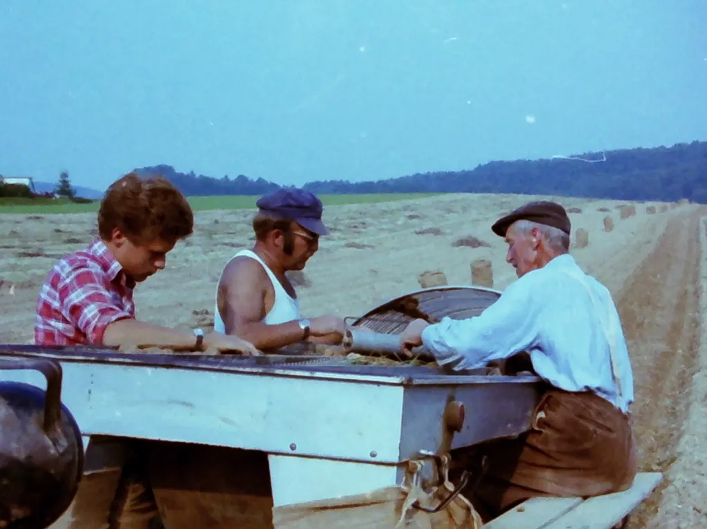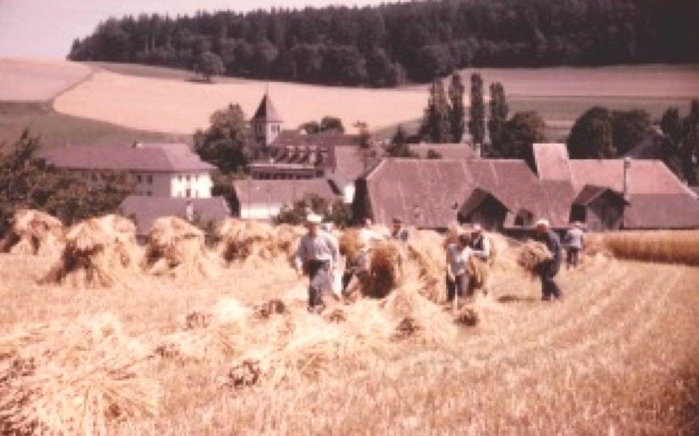 Während der Vegetation musste jeden Morgen eine grosse Mannschaft für die 90 Kühe das Gras auf den Feldern holen. Das seien immer drei Fuder gewesen. Mit der Sense habe man es zuerst mähen müssen, dann von Hand auf die Wagen laden. Damit es schneller ging, musste man die Sensen am Vortag gedengelt haben. «Um 7 Uhr mussten die Grasfuder jeweils vor den Ställen stehen», weiss Hans Schmid noch. Der Verwalter habe in dieser Zeit viel kontrolliert. Und wehe, die drei Fuder Gras standen vor dem Morgenessen nicht an ihrem Platz. Da es in der alten Scheune noch kein grosses Tenn gab, mussten die Melker das Gras jeweils von Hand hineintragen. [IMG 4-5]