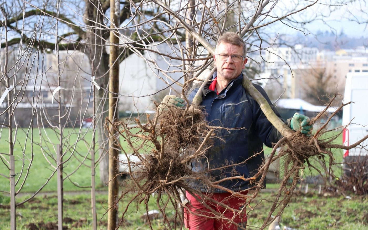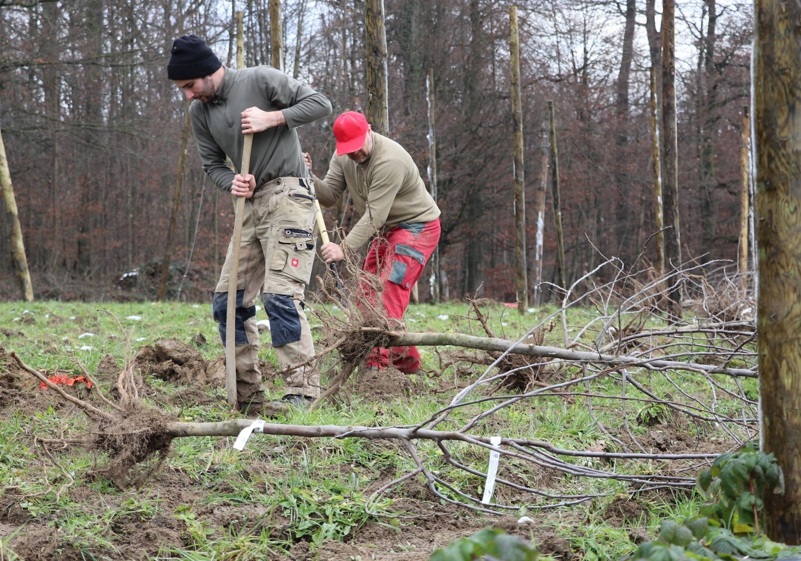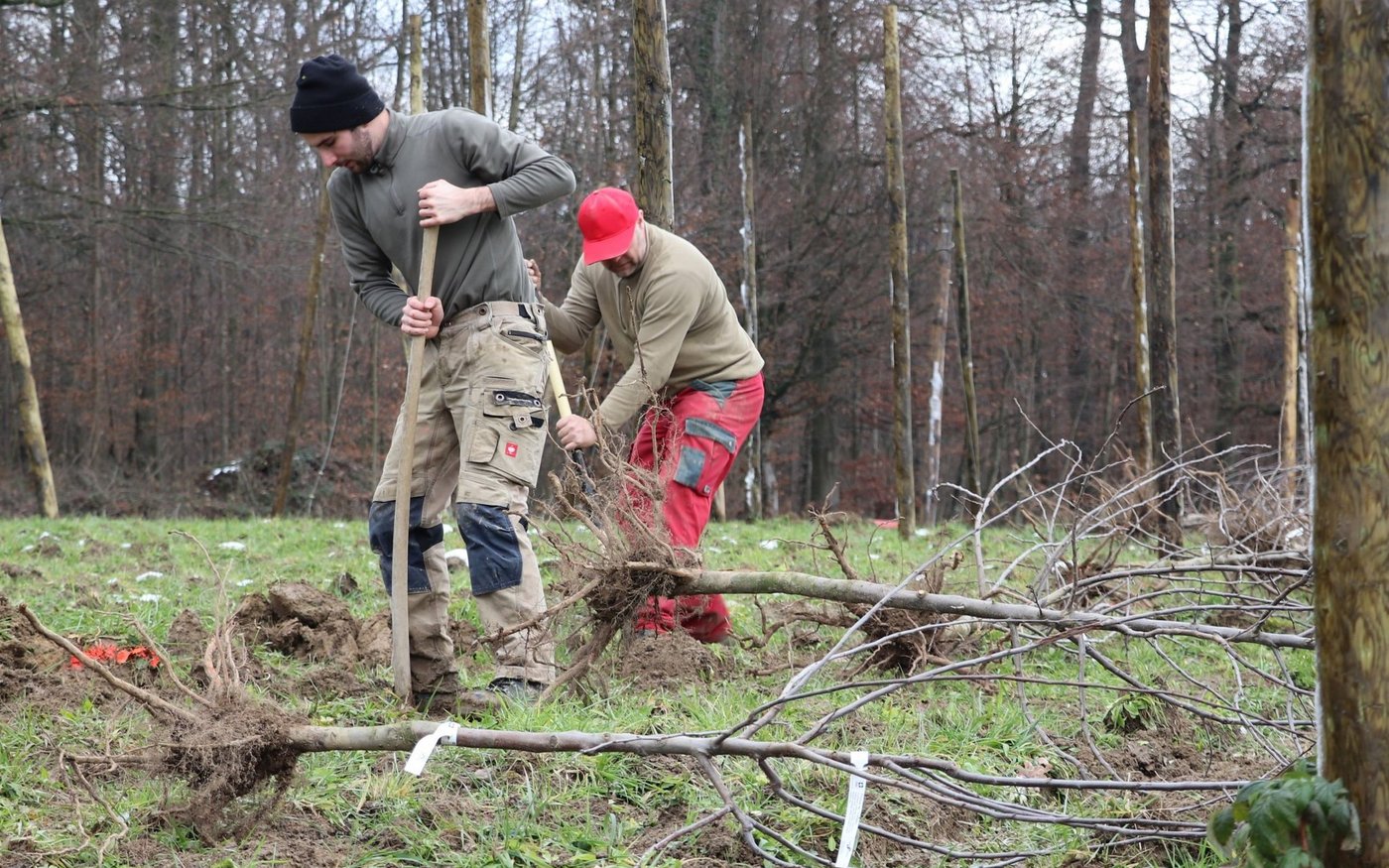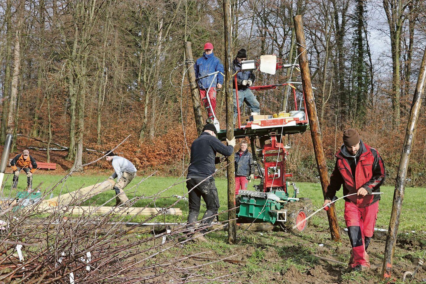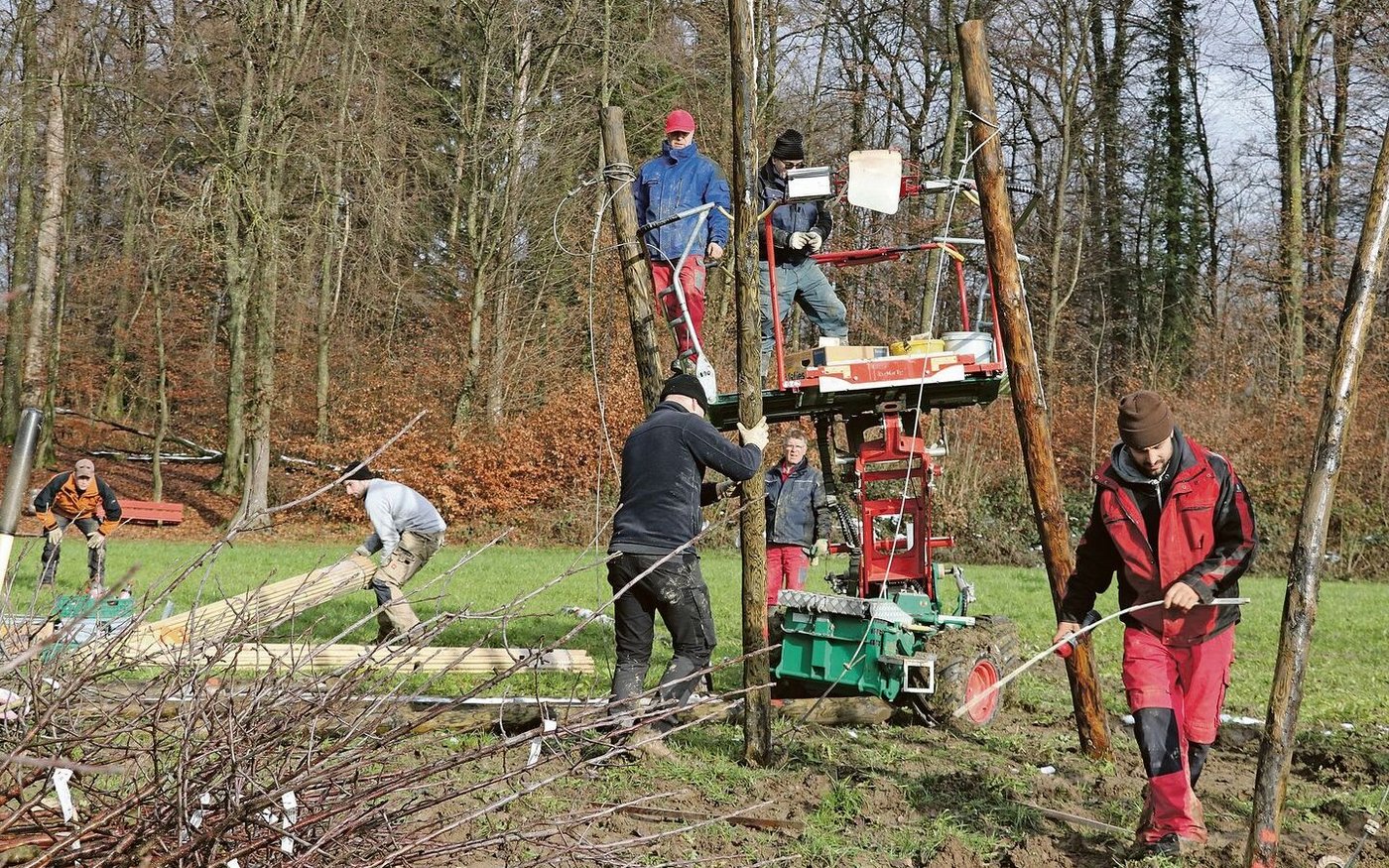 Trotz frostigem Wintermorgen friert hier keiner, denn die Arbeit ist anstrengend und das Tempo hoch. Meterlange Holzstangen werden über das Feld getragen, ein Bagger rammt sie in den Boden. Auf einer fahrbaren Hebebühne befestigen zwei Männer Ankerseile. Andere messen Abstände aus, graben Löcher, setzen Bäume ein. Und bereits nach dem Mittag ist das Werk vollbracht: Eine rund 1200 Quadratmeter grosse…
