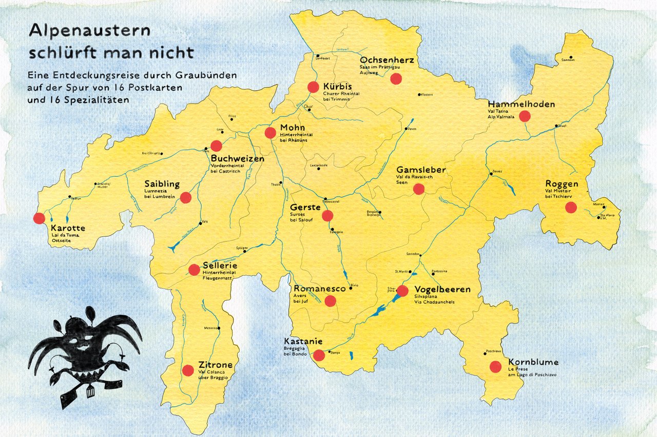 Auf jeder dieser Karte beschreibt die Verfasserin ihre Erlebnisse auf einer Tour durch Graubünden, bei welcher jeweils eine regionale Bündner Spezialität die Hauptrolle spielt. Ihre mit Aquarellen bebilderten Erzählungen inspirierten Herzog dazu, sich seinerseits aufzumachen und die damalige Reise zu rekonstruieren. Gar nicht so einfach, musste er schnell feststellen. Was meinte Osamine bloss mit dem frischen Ochsenherz, das sie im Prättigau von einem Hirten vorgesetzt bekam und mit etwas Erdbeeressig verkostete? Oder handelte es sich dabei um eine Pilzart oder um eine Tomatensorte?