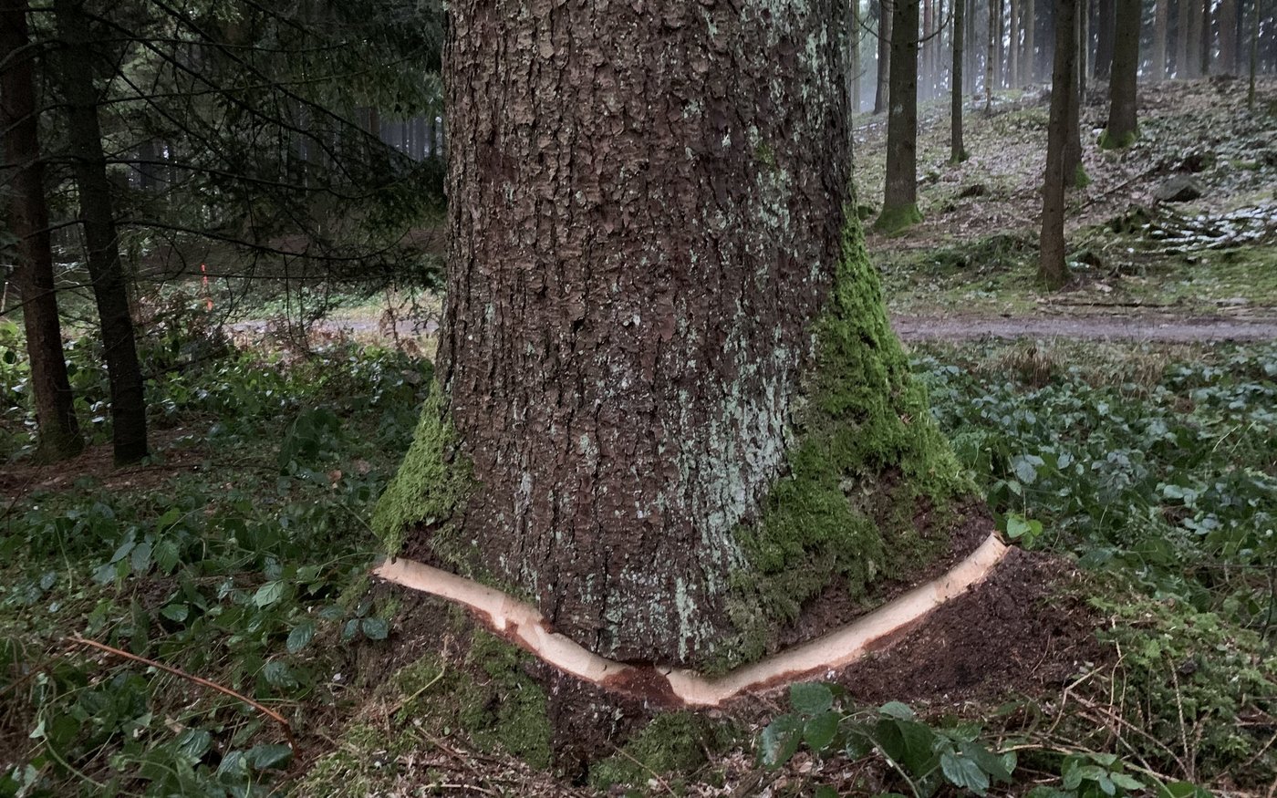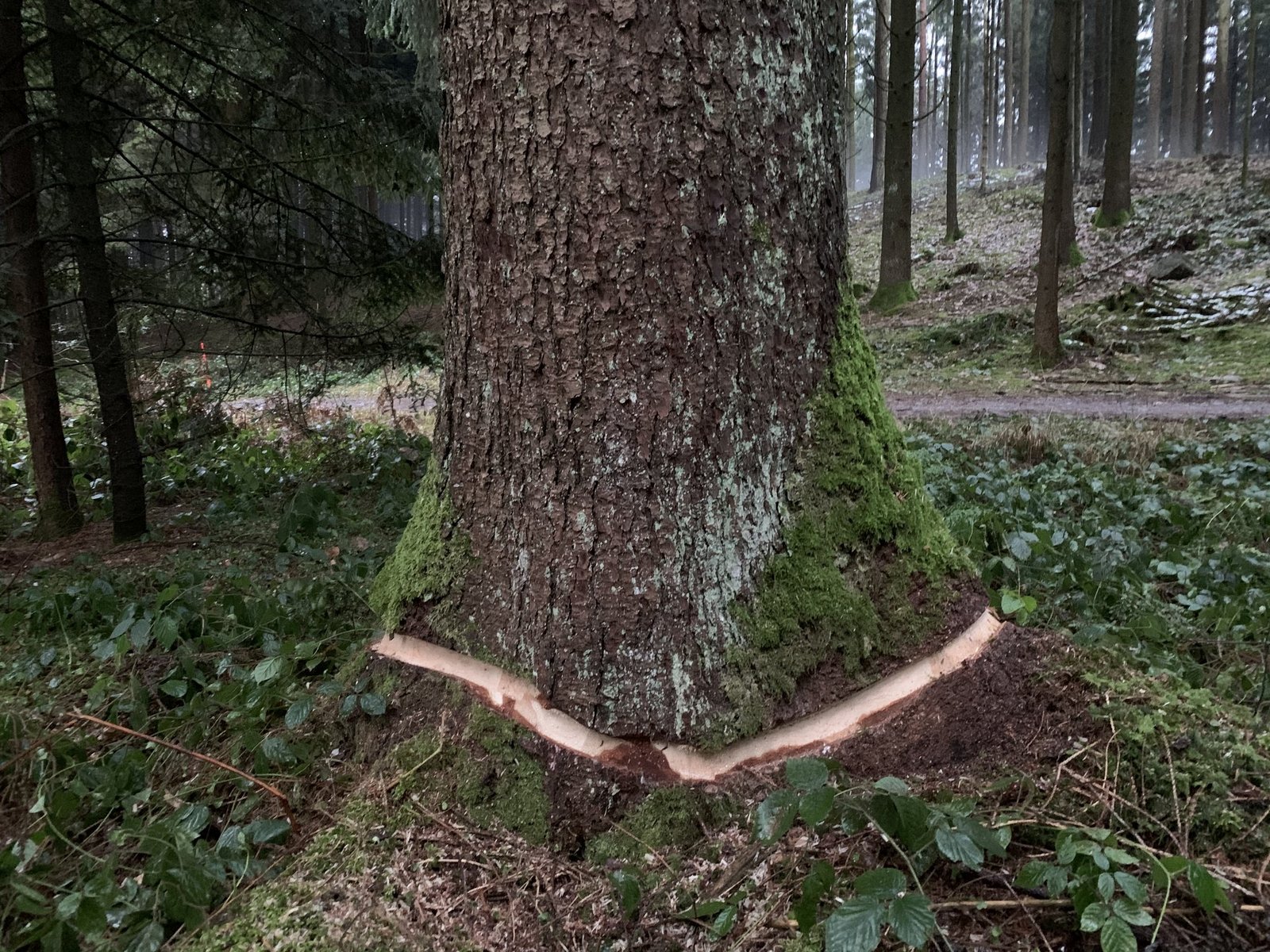 Unterwegs mit dem Betriebsförster im Meggerwald letzten Januar. Wir besichtigen die geringelten Bäume, deren Stämme an vorherigen Mondtagen so behandelt wurden. Das gibt Bauholz für unser künftiges neue Wohnhaus in Vollholzbauweise. Was ich erst später vernahm: Die geringelten Bäume lösten bei Spaziergängern Empörung aus, Vandalen wurden vermutet, bei der Gemeinde gingen Klagen ein und ein klärender Text in den Medien war nötig. Das zeigt, bezüglich Naturverständnis braucht es noch viel mehr Aufklärungsarbeit gegenüber der zunehmend naturentfernten Gesellschaft. Wie schon die Agrar-Initiativen zeigten.