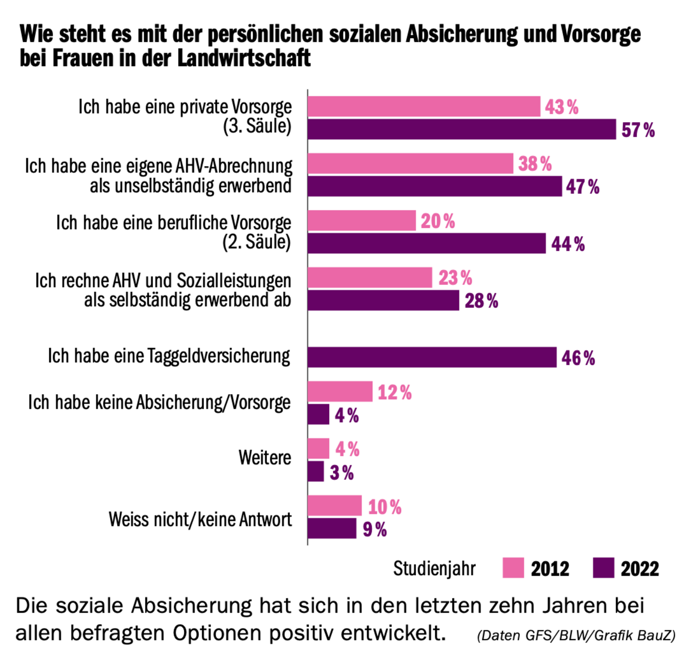 Erfreulich ist zu sehen, dass sich die soziale Absicherung der Frauen im Laufe der letzten zehn Jahre positiv entwickelt hat. Der Anteil ohne eigene Absicherung und Vorsorge ist im selben Zeitraum von 12 auf 4 % gesunken. 57 % verfügen mittlerweile über eine 3. Säule (2012: 43 %), 44 % über eine 2. Säule (2012: 20 %).