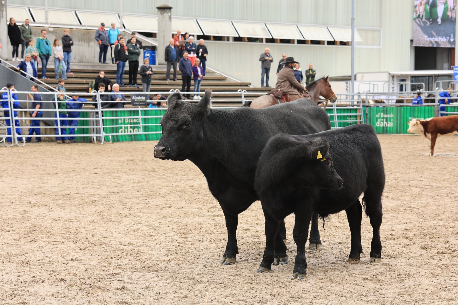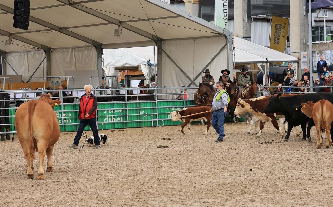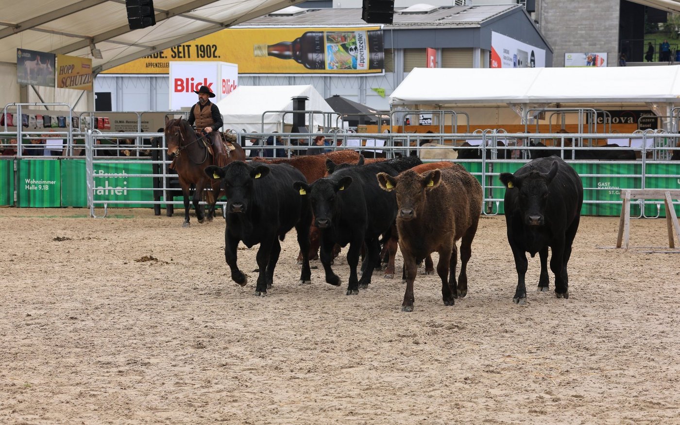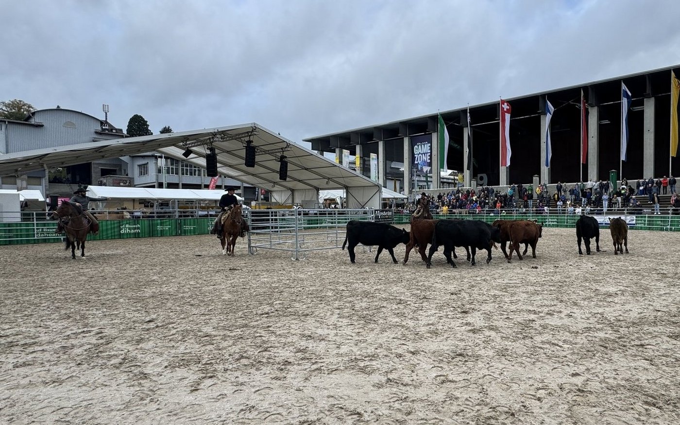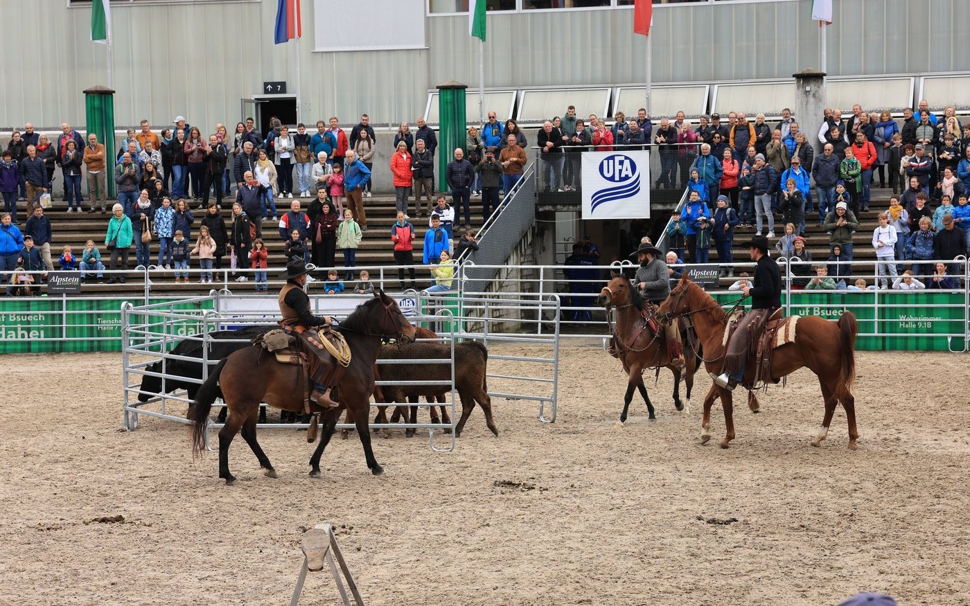 Ebenfalls in der Arena präsent waren die «Cowboys» von der Stone Ranch aus Wegenstetten. Es waren Stefan, Silvan und Thomas Schreiber. Sie waren hoch zu Ross und demonstrierten eindrücklich während des ganzen Anlasses, wie sie die Kühe nach der Methode der «low stress stockmanship» in der Arena trieben.