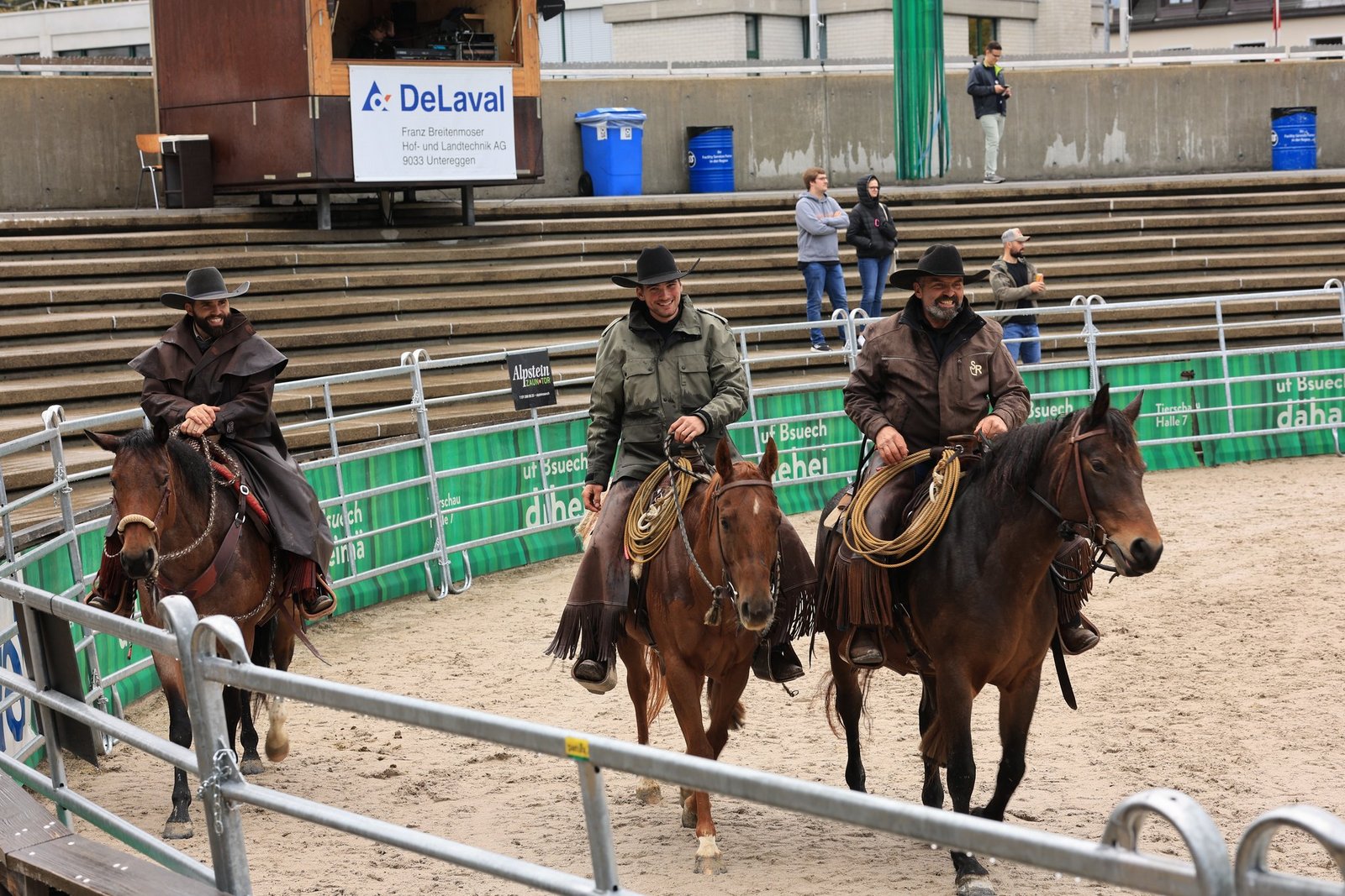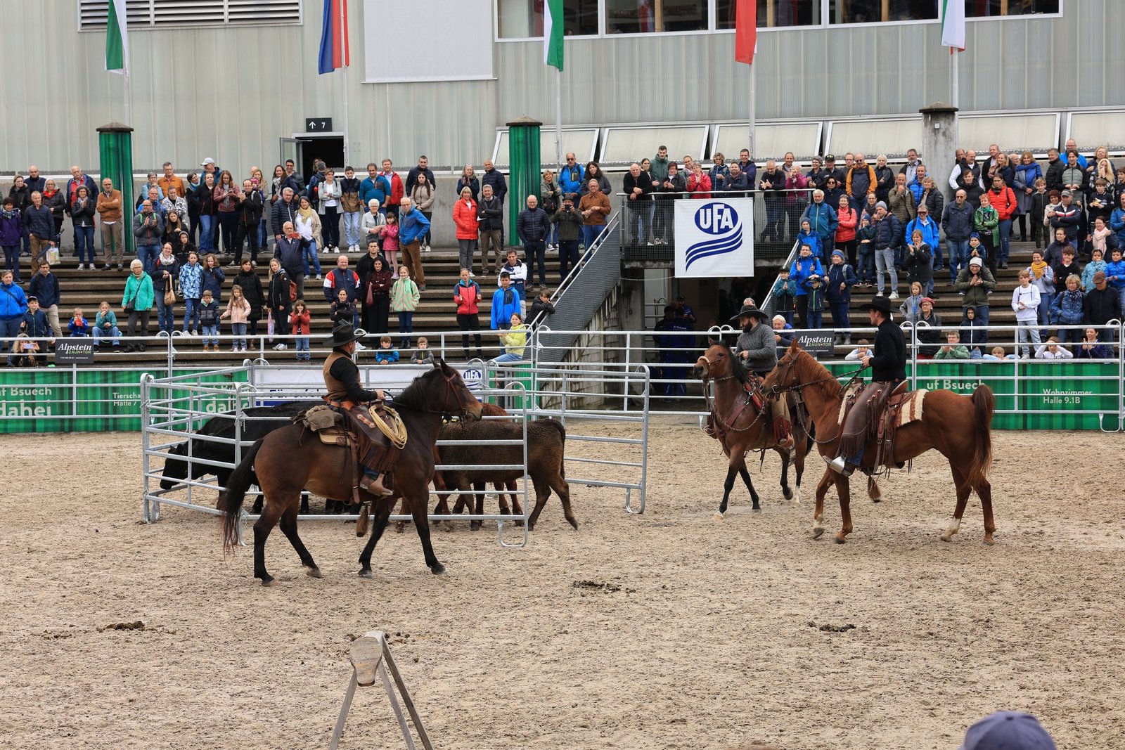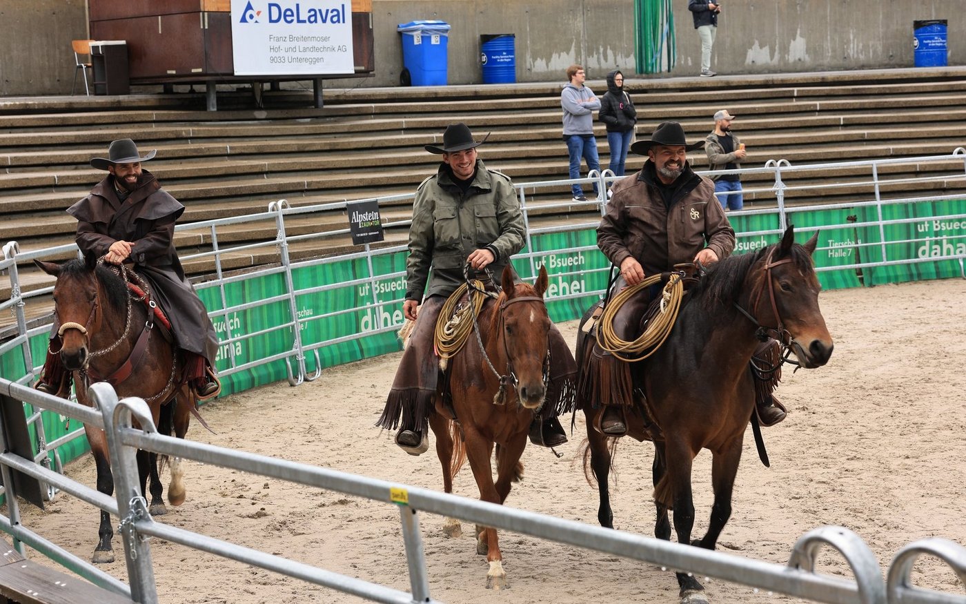 Anschliessend wurden die Tiere in der Arena ausgewechselt. Die verschiedenen Rassen kamen raus und eine kleine Herde von Rindern kam rein. Nun kamen wieder Stefan, Silvan und Thomas Schreiber von der Stone Ranch zum Zug.