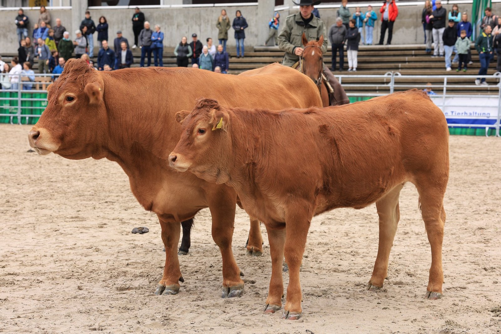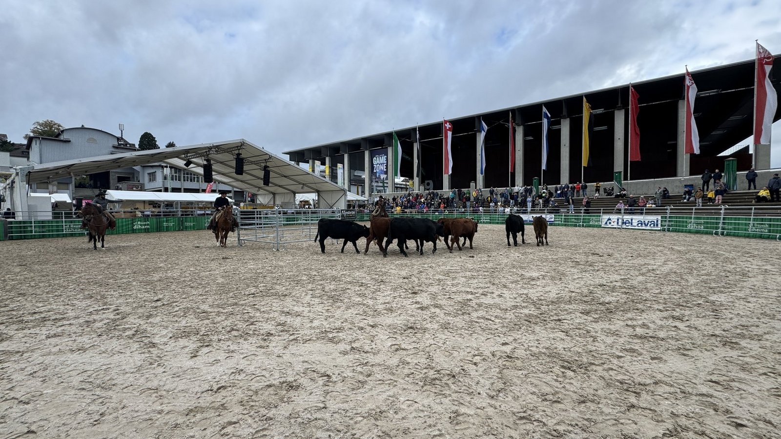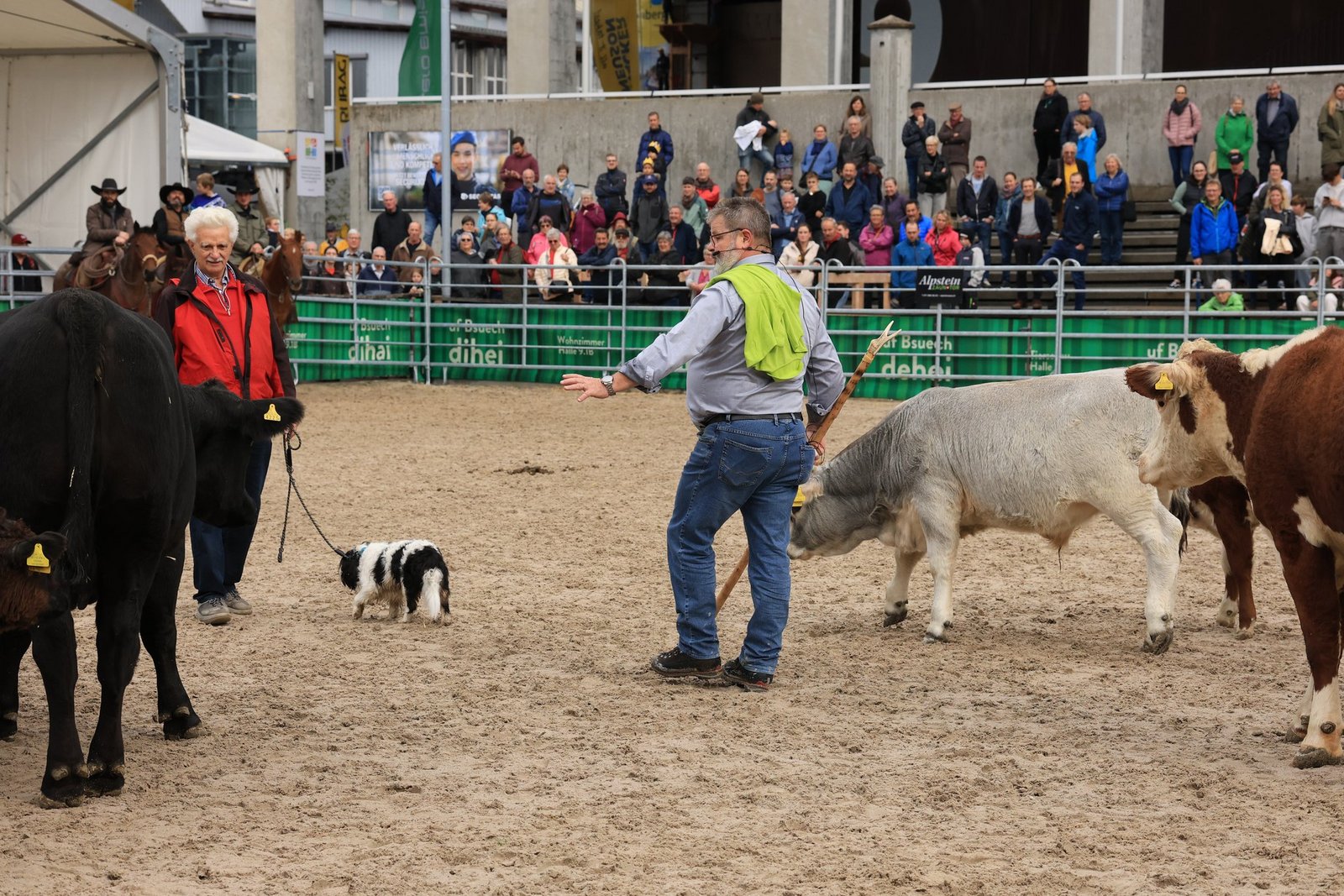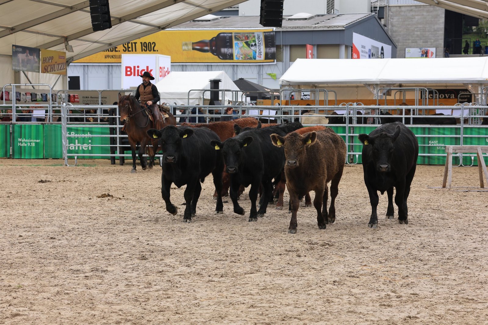 Anschliessend wurden die Tiere in der Arena ausgewechselt. Die verschiedenen Rassen kamen raus und eine kleine Herde von Rindern kam rein. Nun kamen wieder Stefan, Silvan und Thomas Schreiber von der Stone Ranch zum Zug.
