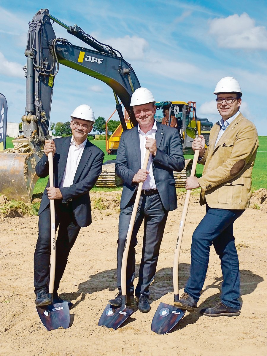 Der Bagger steht bereit und der Direktor des landwirtschaftlichen Instituts des Kantons Freiburg in Grangeneuve, Pascal Toffel, sowie die beiden Staatsräte Didier Castella und Jean-François Steiert halten medienwirksam die Schaufel zum Spatenstich in der Hand. Im Hintergrund stehen die Gebäude von Agroscope in Posieux.