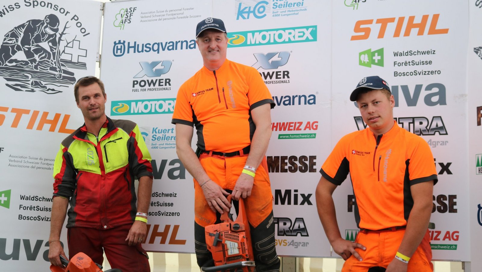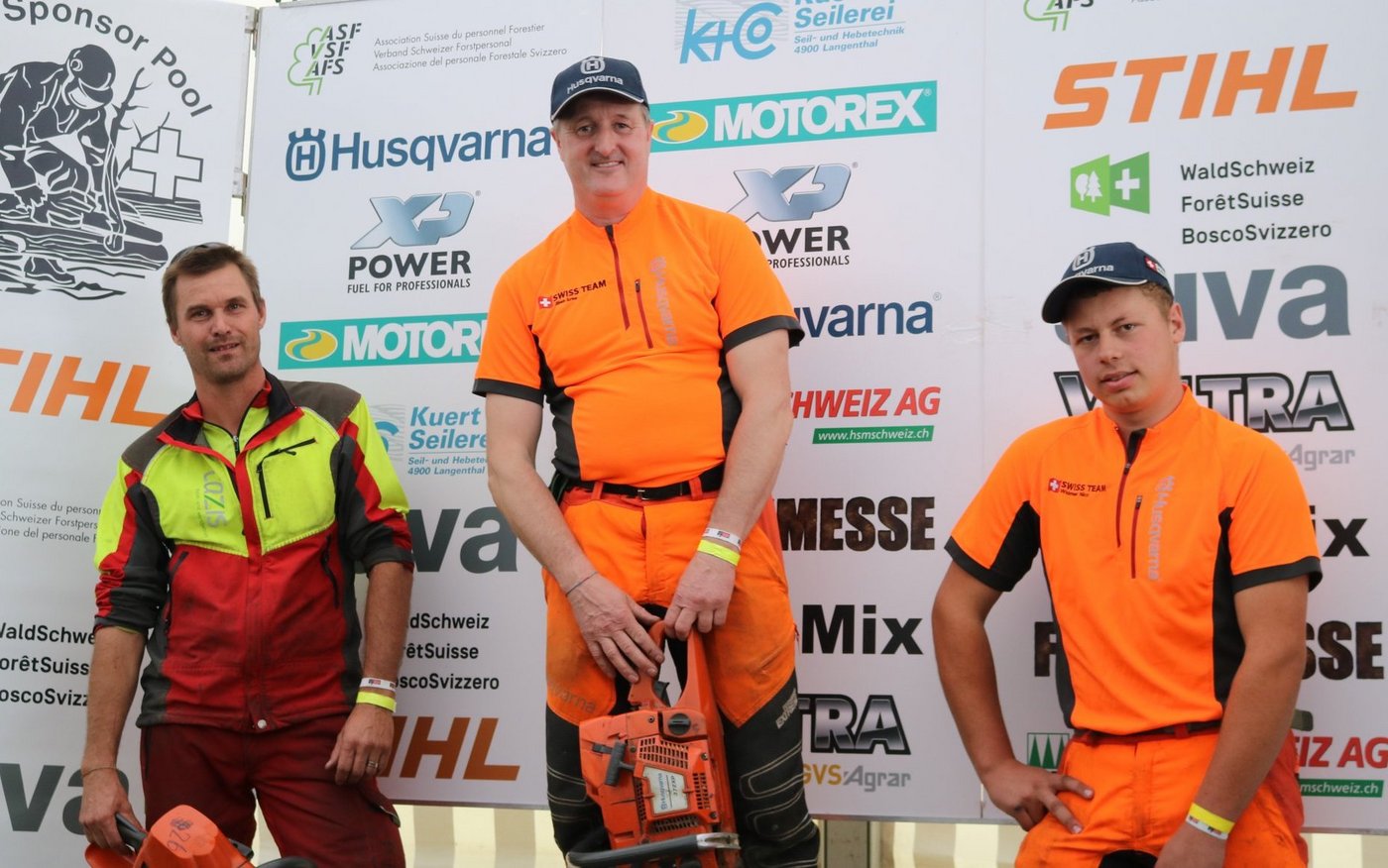 Arno Illien wurde Bündner Meister in der Holzhauerei, den zweiten Platz errang Ralf Prinoth und Dritter wurde Nico Widmer.