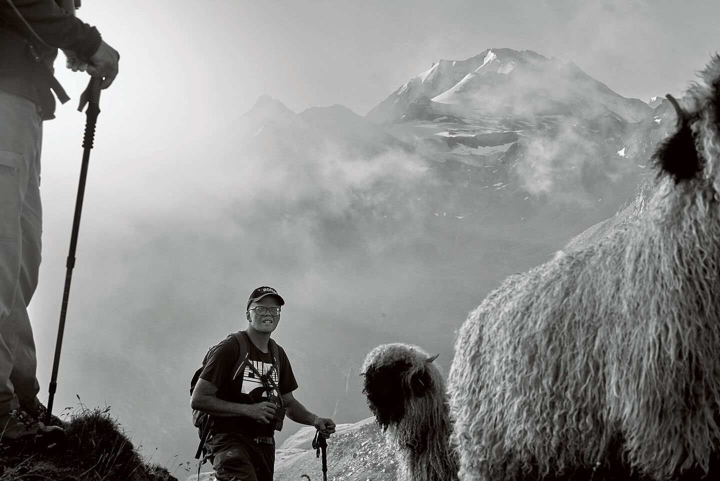 Rici und ich stehen auf einem schmalen Grat auf 2600 Metern und starren auf eine Gruppe von Schwarznasenschafen. Starren sie zurück? Es ist unmöglich zu sagen, denn ihre Augen sind durch wollige Schwärze verdeckt. Weit unten liegt das Tal, das nach Zermatt und Saas Fee führt. Und ganz unten, zu unserer Linken: die Alp Unners Fulmoos. «Dort ist der Mensch völlig von der Umwelt abgeschnitten. Die nächste Hütte ist kilometerweit entfernt, und kein Wanderer kommt hierher.»