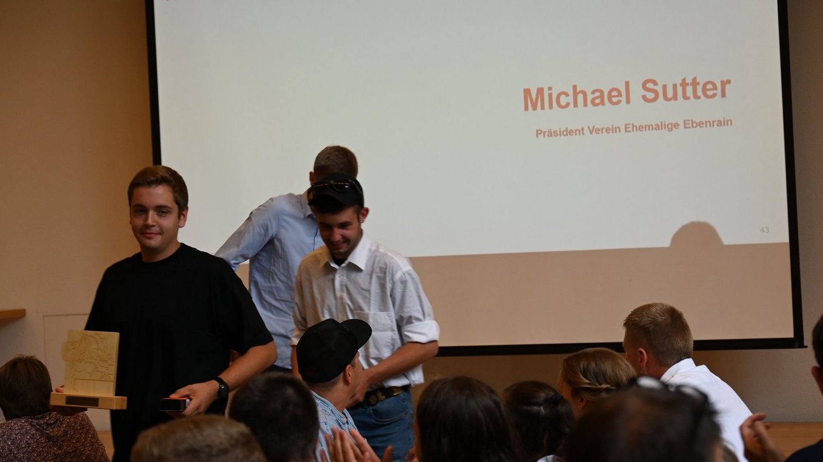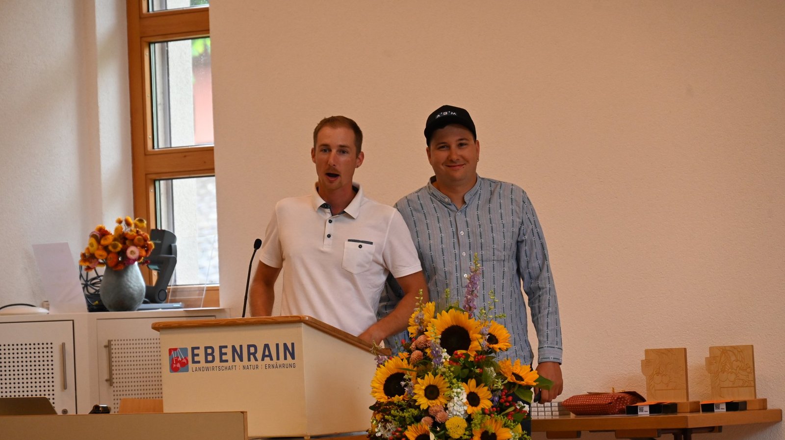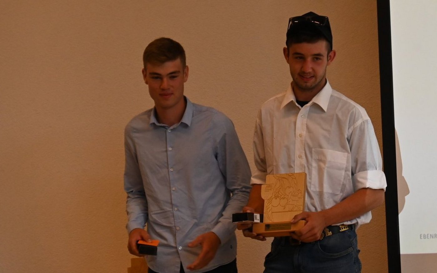 Meist laufen die Abschlussfeiern an den Berufsbildungsstätten jedes Jahr nach dem bewährten Muster ab. Heuer hingegen gibt es am Ebenrain eine Neuheit. Die Ehemaligen Ebenrain verleihen zum ersten Mal zwei Wanderpreise. Michael Sutter, Präsident Verein Ehemalige Ebenrain vergibt die eine goldene Kirsche für den besten Fachvortrag. Diese holt sich Matthias Zwygart aus Tenniken. Die zweite goldene Kirsche geht an den besten Vortrag im Bereich allgemeinbildender Unterricht (ABU). Diesen Preis holen sich Timon Ballmer, Oberdorf, und Roman Mundwiler, Zunzgen, für ihre Teamarbeit. [IMG 5]