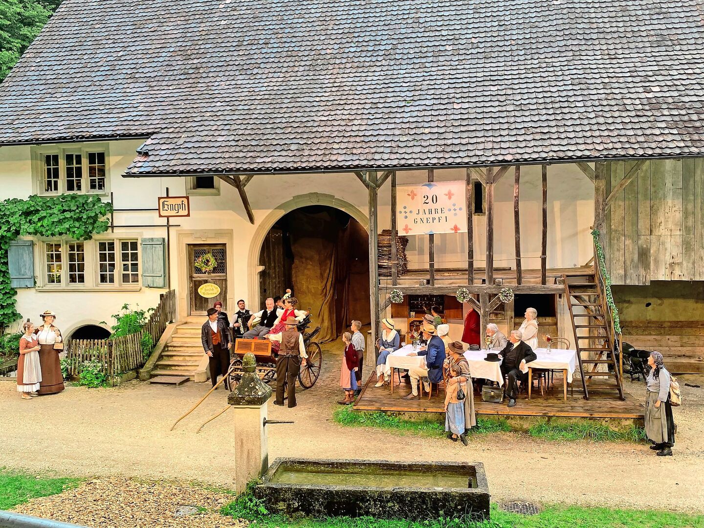 Diese Szene ist Teil der Freilichtaufführung «Der Geltstag» auf dem Ballenberg. Nach einem feinen und ausgiebigen Znacht am Theater-Buffet sitze ich mit Freunden auf der gedeckten Tribüne. Vor uns steht das Bauernhaus aus dem Jahr 1675 aus Therwil BL. Dieses ist zum Wirtshaus Gnepfi geworden.