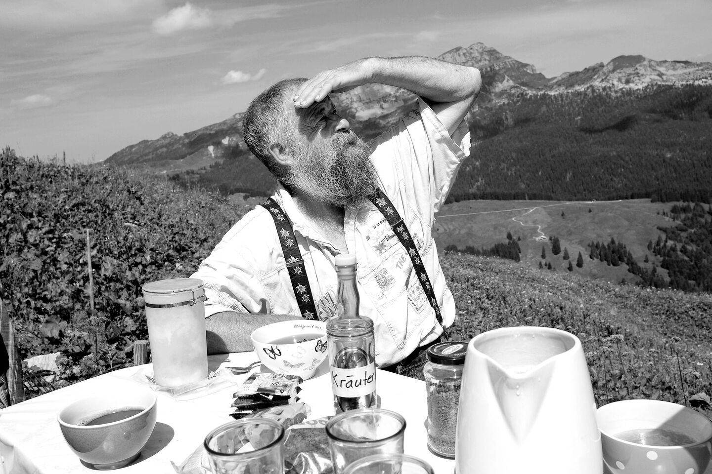 Er schlägt mit der Faust auf den Tisch, plättet Brämen und stösst die Kaffeetassen um. Sie sehen rustikal aus, aber sie sind von Bertelsmann. Wernu trinkt wie immer Chrüter zum Kaffee und behält mit seinem Fernglas alles unter uns im Auge, er sieht aus wie eine Art wohlwollender Emmentaler Gott in den Ferien. Was für eine Reise war das für mich seit diesem Tag vor so vielen Jahren. Als Aussenstehender wurde ich vor solchen Männern gewarnt: Sie sollten hart, stur und unfreundlich sein. Stattdessen empfand ich sie als warmherzig und einladend, und sie strotzten nur so vor Charakter. Es war ein unglaubliches Privileg, an ihrem Leben teilhaben zu dürfen.