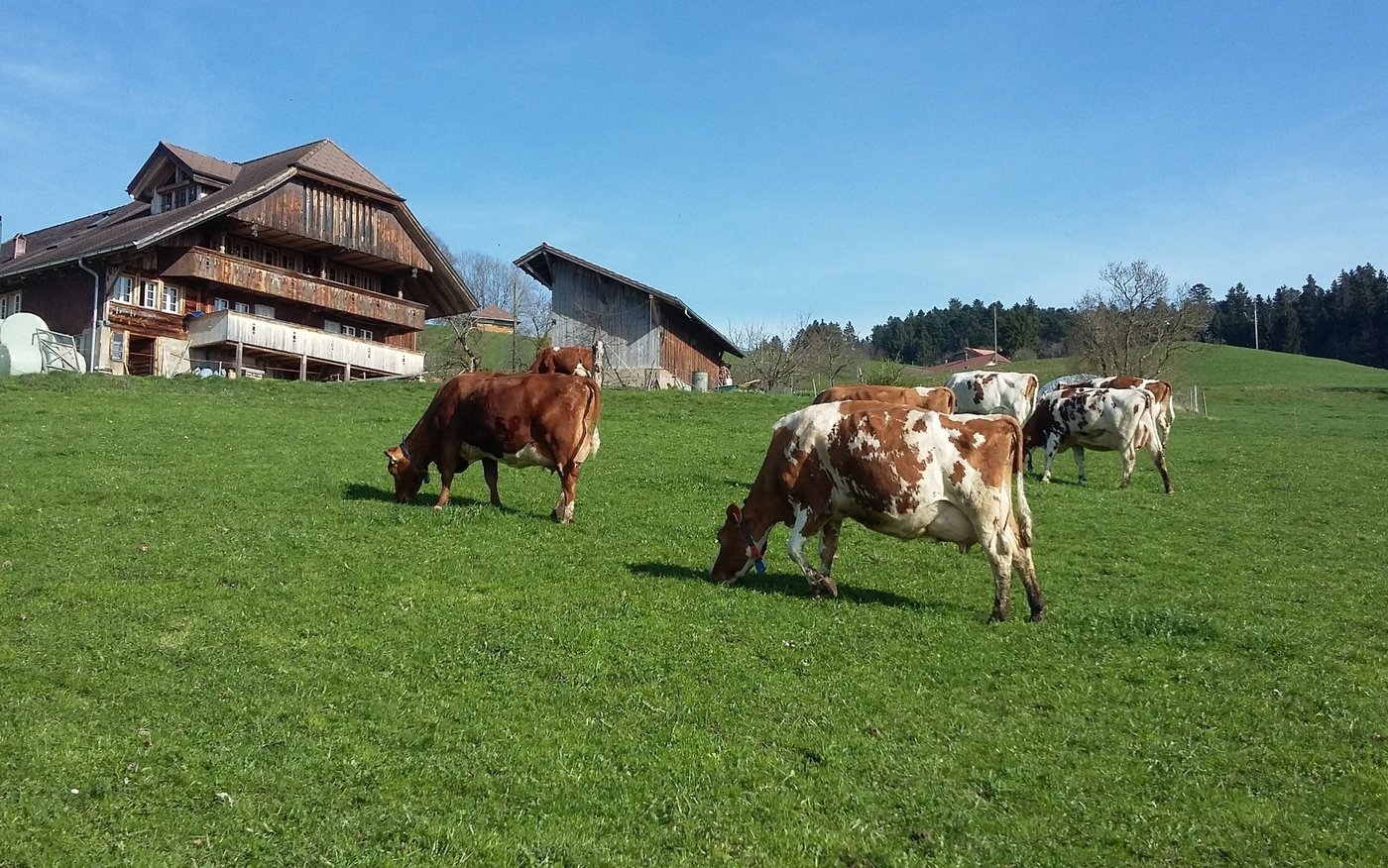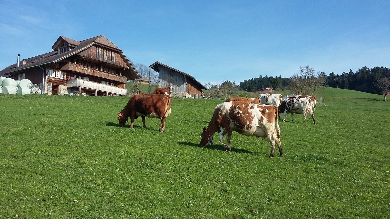 Der Schalleberg-Hof wird nach IP-Suisse-Richtlinien bewirtschaftet. Alle Tiere können regelmässig nach draussen – entweder auf die Weide oder im Auslauf. Bei den Milchkühen verfolgen Mühlemanns ein Low-Input-Prinzip, das heisst, dass die Kühe das meiste Futter draussen auf der Weide fressen.