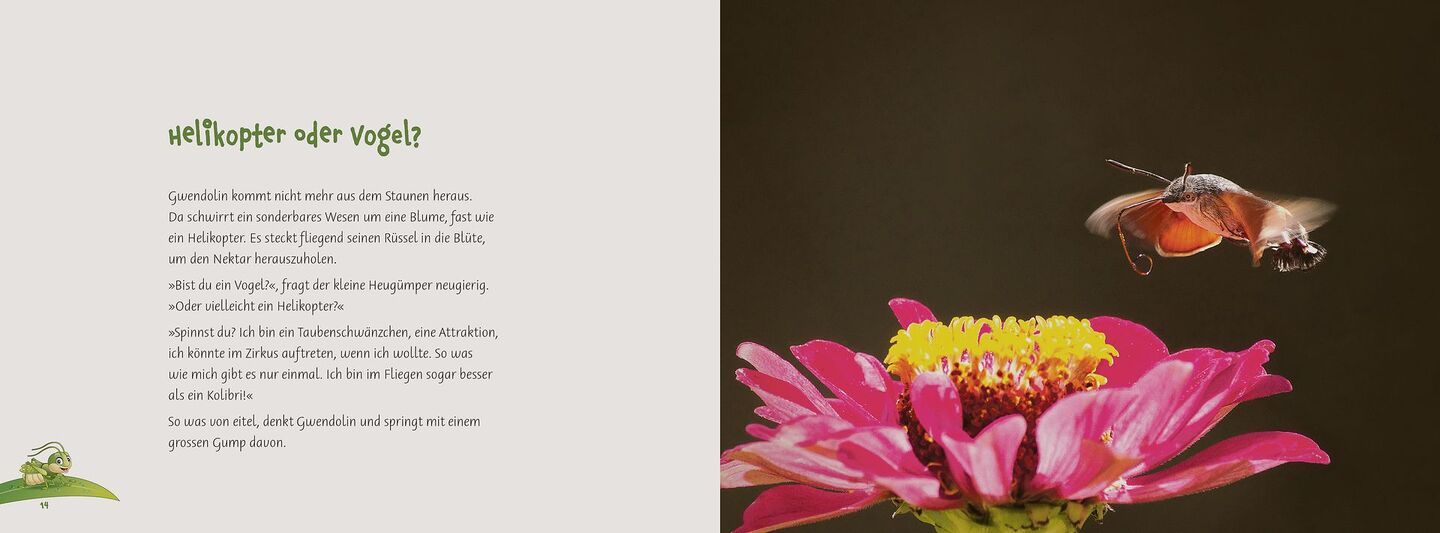 Im Buch erklärt jede dieser neuen Bekanntschaften der jungen Heuschrecke ein Stück der Insektenwelt. Durch die Fotografien wirkt das Bilderbuch auf den ersten Blick eher wie ein Bildband. «Es soll uns Tiere näher bringen, denen der Kuschelfaktor fehlt» schreibt Bruno Schlatter im Vorwort. «Auch sie zeigen uns die Vielfalt und die Schönheit der Natur.»