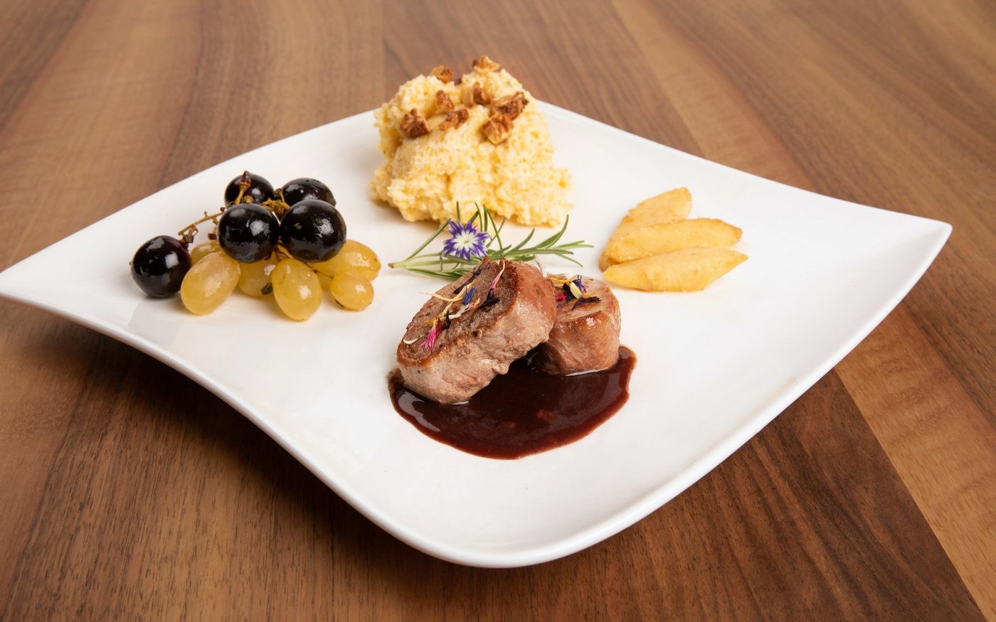 Mit der Sauce auf den vorgewärmten Tellern einen Saucenspiegel bilden. Je zwei Medaillons darin anrichten. Mit getrockneten Blüten bestreuen. Polenta, gebratene Trauben und karamellisierte Quittenschnitze dazu anrichten. Polenta mit gehackten Baumnüssen belegen.