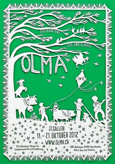 Ein grosses Medienecho löste das Plakat aus dem Jahr 2012 aus. Es sei zwar im grafischen Sinne «kein echtes Plakat», wie die Olma Messen schreiben, aber den Blick des Betrachters fängt es allemal: Es ist der Scherenschnitt der Bäuerin Jolanda Brändle. Diesen fertigte sie abends nach getaner Arbeit an und trug ihren Entwurf an die Olma Messen St. Gallen AG heran, die der Bäuerin schliesslich einen Auftrag unterbreitete. Mit dem Endresultat gelang ihr der nationale Durchbruch als Scherenschnitt-Künstlerin. Heute betreibt Brändle in Mosnang SG einen Kunsthandwerk-Laden mit dem Namen «Schererei». «Solche Einreichungen sind eher selten», sagt Katrin Meyerhans. Die meisten Plakate realisieren Kunstschaffende, Schülerinnen und Schüler von Kunstgewerbeschulen, Schulen für Gestaltung, Agenturen oder Grafikbüros.