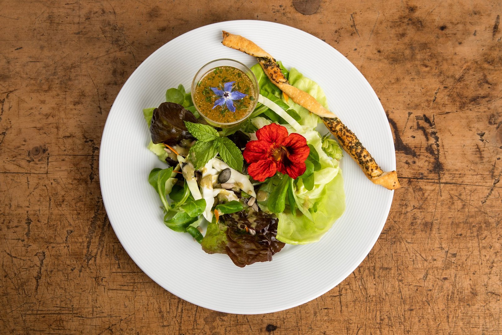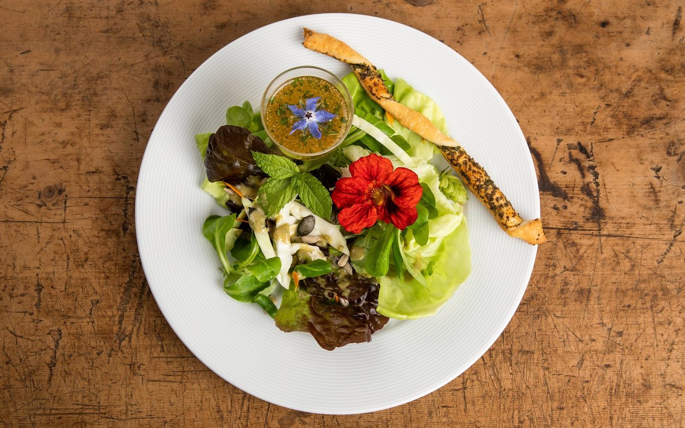 Blattsalat in eine Salatschüssel geben, Hausdressing zugeben, kurz mischen. Auf Vorspeiseteller anrichten. Wildkräuter, Blüten und geröstete Kernen über den Salat streuen. Kräuterflûte und Apfel-Wildpflanzen-Smoothie dazu anrichten.