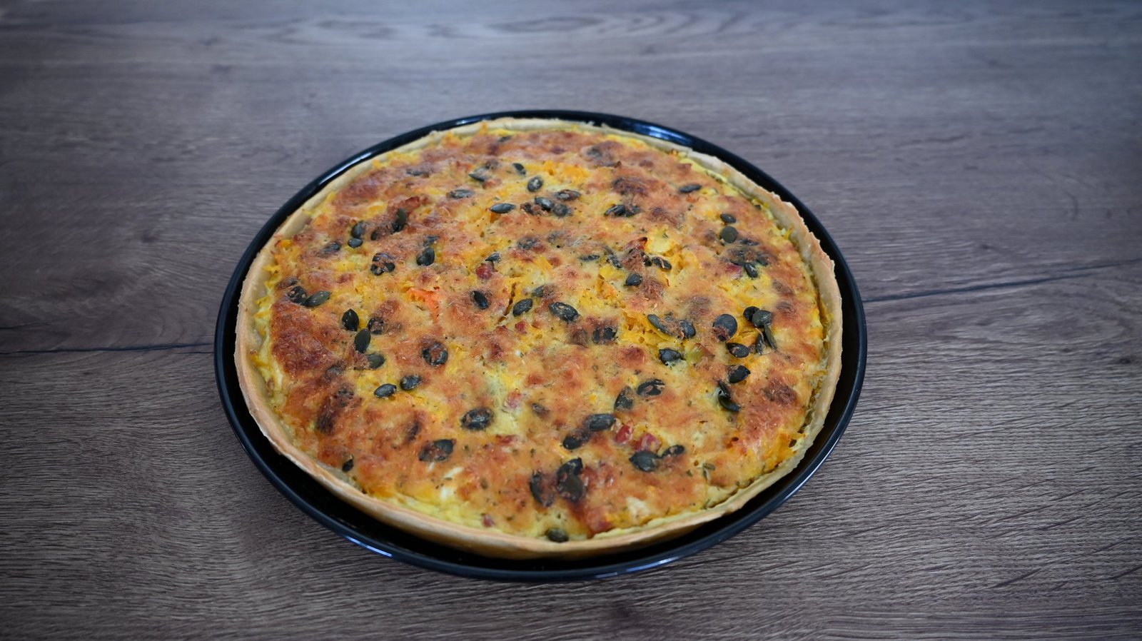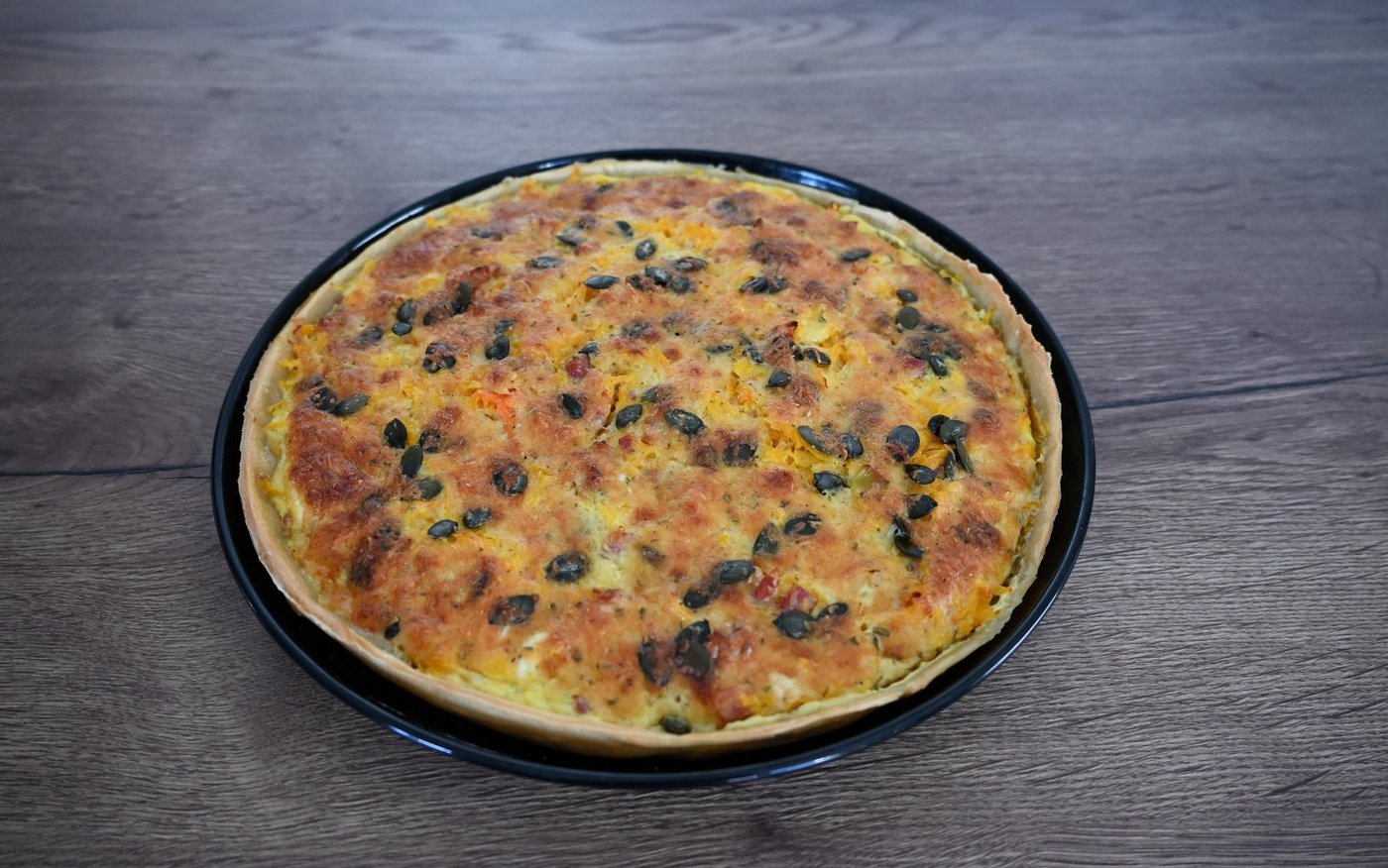 - Kürbis mit Speck, Zwiebeln und Reibkäse mischen und auf dem Kuchenboden verteilen.