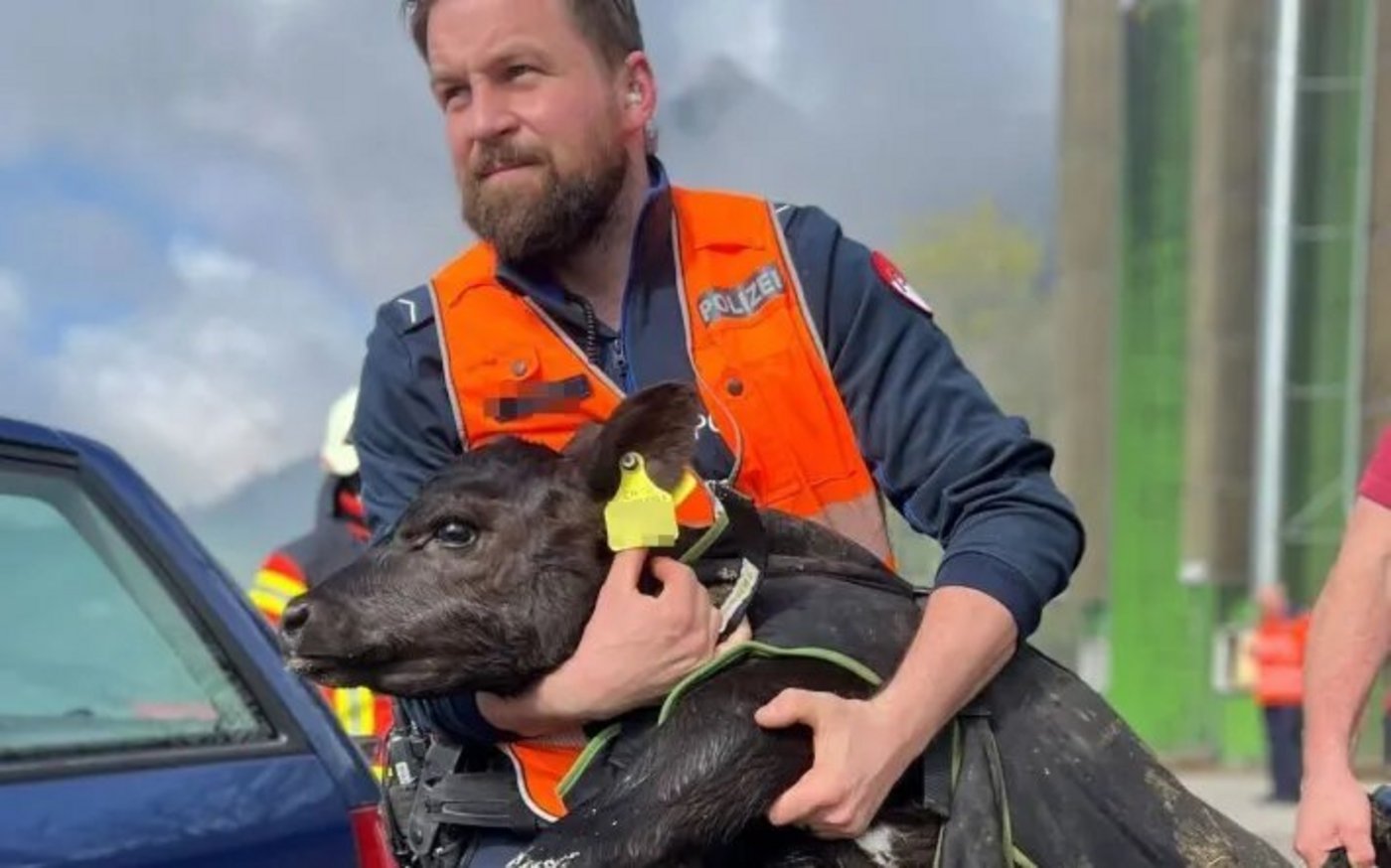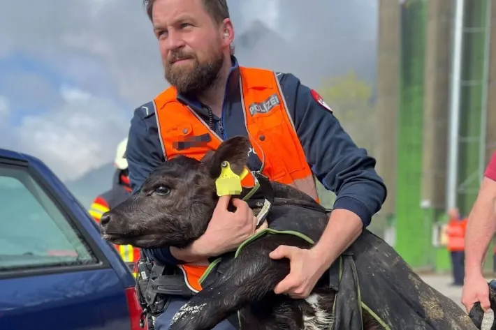 Es ist herzergreifend: Ein Polizist trägt im Einsatz ein junges Kalb in seinen Armen, das er aus einem brennenden Stall in Sicherheit bringt. Diese Fotografie hat die Solothurner Kantonspolizei auf einem Hof in Günsberg gemacht.