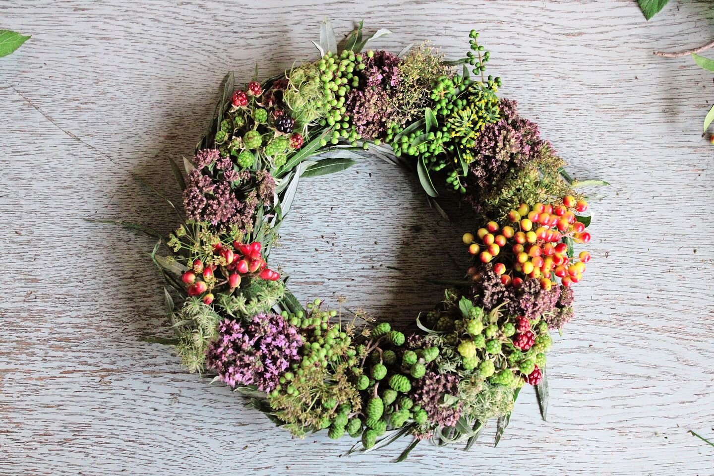 - Blumen, Kräuter und Samenstände wie wilde Möhre, Kerbel, Majoran