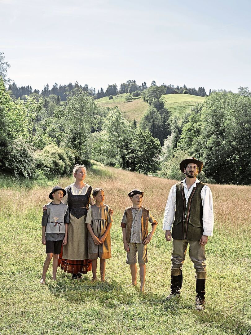 Spielort ist unser Bauernhof Spycher Handwerk. Er eignet sich von der Infrastruktur – Parkplätze und Festwirtschaft – her sehr gut. Zudem liegt der Spielort naturnah, mit Wiesen rundherum und Wald im Hintergrund. Auf dem Spielgelände ist das Moderne weit weg, sodass man sich wirklich in eine frühere Zeit versetzt fühlt.