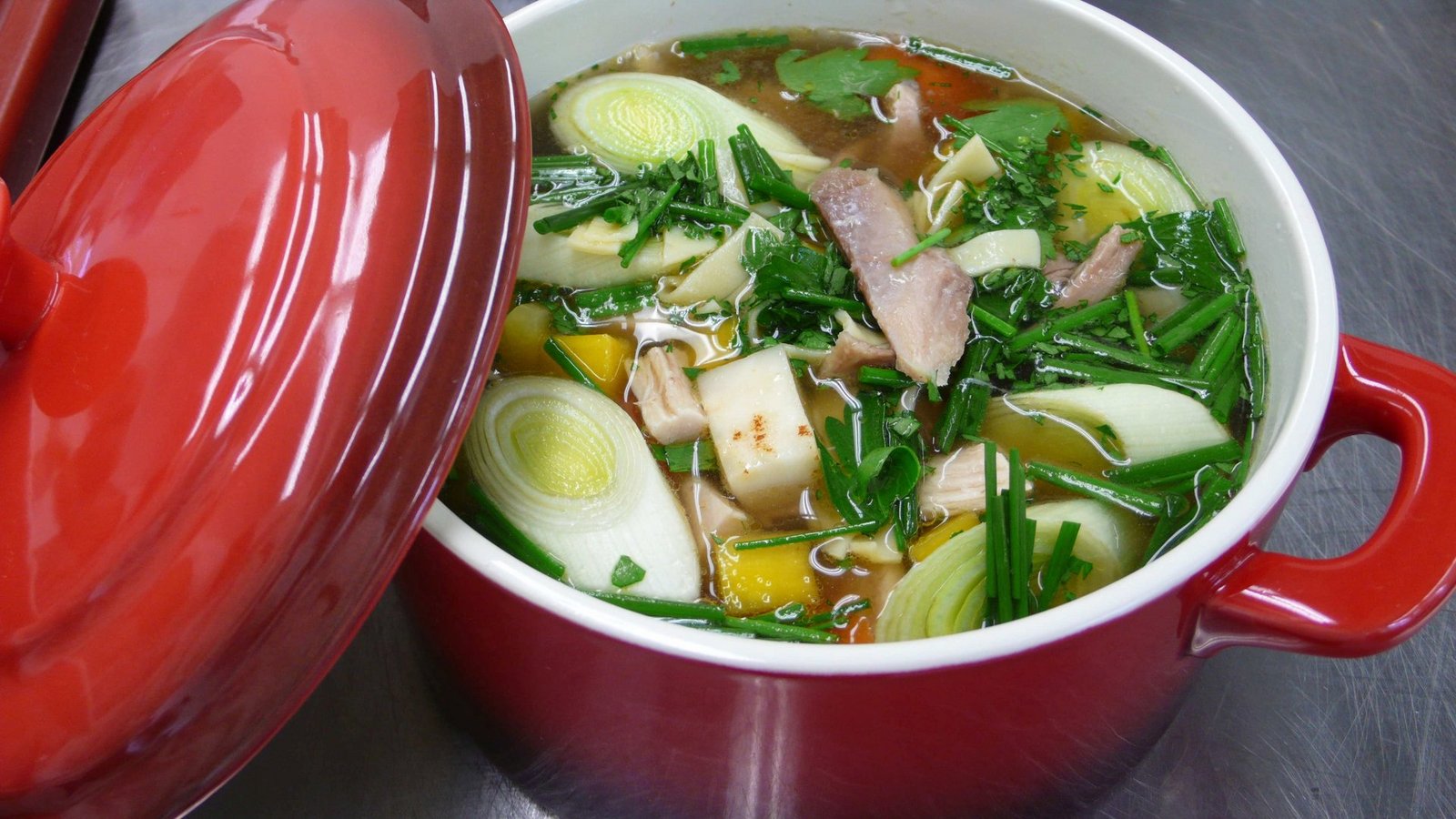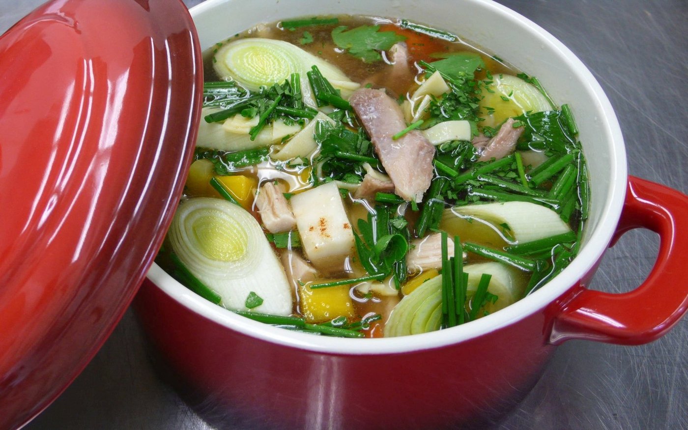 5. Das bunte Wurzelgemüse, die Nudelfetzen bzw. Kartoffeln und das Fleisch schichtweise in einem Suppentopf anrichten. Mit abgeschmeckter Hühnerbrühe übergiessen, aufkochen, servieren.