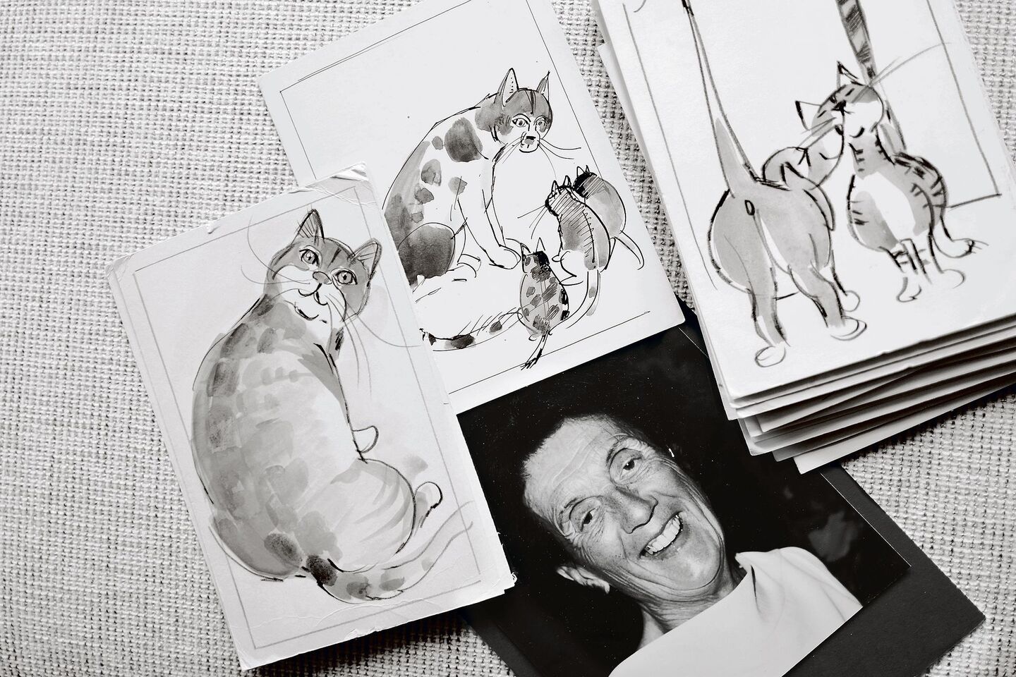 Und nach dieser einen Begegnung begann Kurt, sie auf grossen Postkarten zu malen, die er anfertigte, und er schickte ihr jeden Tag eine, wenn sie im Altersheim lebte. Auf den meisten war sie zu sehen, und auf den anderen war seine Katze Kater Kobi zu sehen. Und Rösi zeigte die Karten jedem, der zu Besuch kam.
