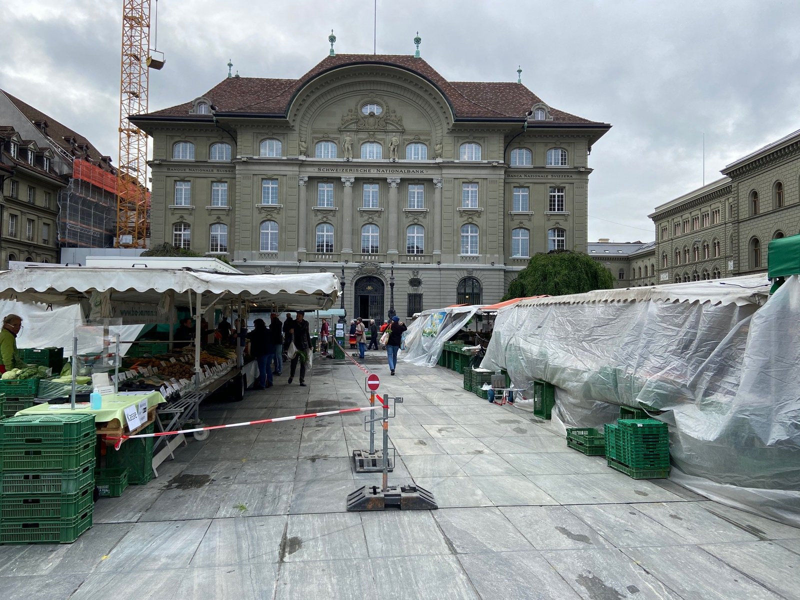 Am Dienstagmorgen konnte in Bern erstmals wieder ein Markt am angestammten Ort stattfinden. Bei kühlen Temperaturen präsentierte sich das Bild aber anders als vor der Corona-Krise. Die Stände sind nur einseitig offen und überall wird mit allerhand Hilfsmitteln die nötige Distanz von mindestens zwei Metern hergestellt.