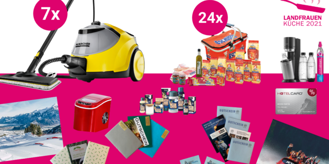[IMG 7] Machen Sie mit bei unserem grossen Wettbewerb. Es gibt Preise im Gesamtwert von über 10'000 Franken zu gewinnen, unteren anderem verlosen wir 7-mal den Dampfreiniger von Kärcher, 24-mal einen Pastakorb von Bschüssig und viele weitere tolle Preise.