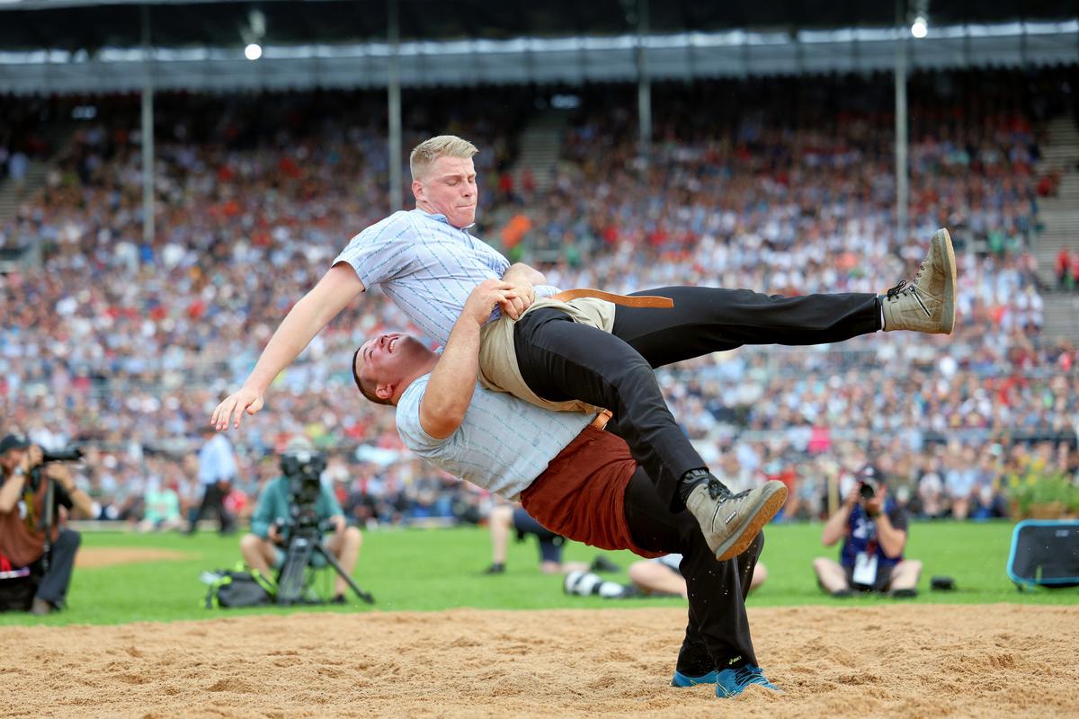 Im Anschwingen bekamen es nun Schneider und Ledermann miteinander zu tun. Der Gang endete gestellt. Schneider eroberte aber mit Sicherheit einige weitere Zuschauerherzen mit einem Souplesse. Der seltene Schwung ist ein Standschwung, bei dem der Gegner von hinten umschlungen, hochgehoben und über den eigenen Kopf nach hinten befördert wird. Die Rückwerts-Flugstunde konnte der wendige Ledermann gekonnt abwehren. Wie 1.93 Meter so durch die Luft fliegen können, ist aber allemal eindrücklich.