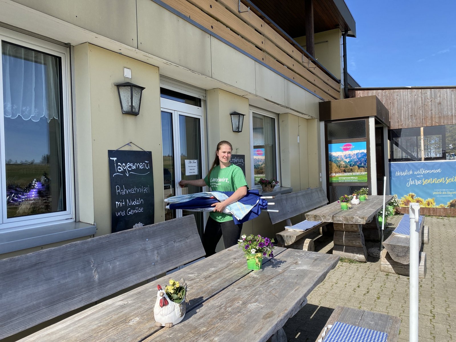 Bis auf Weiteres kurvt Fabienne Kaufmann mit dem Traktor oder per Quad über die Wiese. Beim Restaurant angekommen, springt Mingo vom Fahrzeug, seine Besitzerin folgt ihm ohne Eile. Der Wind zerzaust die farbigen Blumen auf den Terrassentischen und die angehende Landwirtin klappt die Sonnenschirme zusammen. Für heute ist Feierabend – zumindest in der Beiz. Nebenan muht das Vieh und die kleine Gruppe Schafe marschiert selbstständig in Richtung Stall. Noch gibt es Einiges zu tun, das Fabienne Kaufmann mit ruhiger Selbstverständlichkeit in Angriff nimmt.